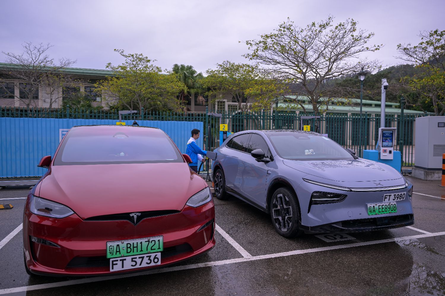 12月23日,香港特区政府运输署与中电源动集团合作在大屿山竹篙湾设立的充电设施正式启用,为“粤车南下”及“港车北上”旅客提供配套支持。图为大屿山充电站迎接首批使用者。(图片来源:中新社)