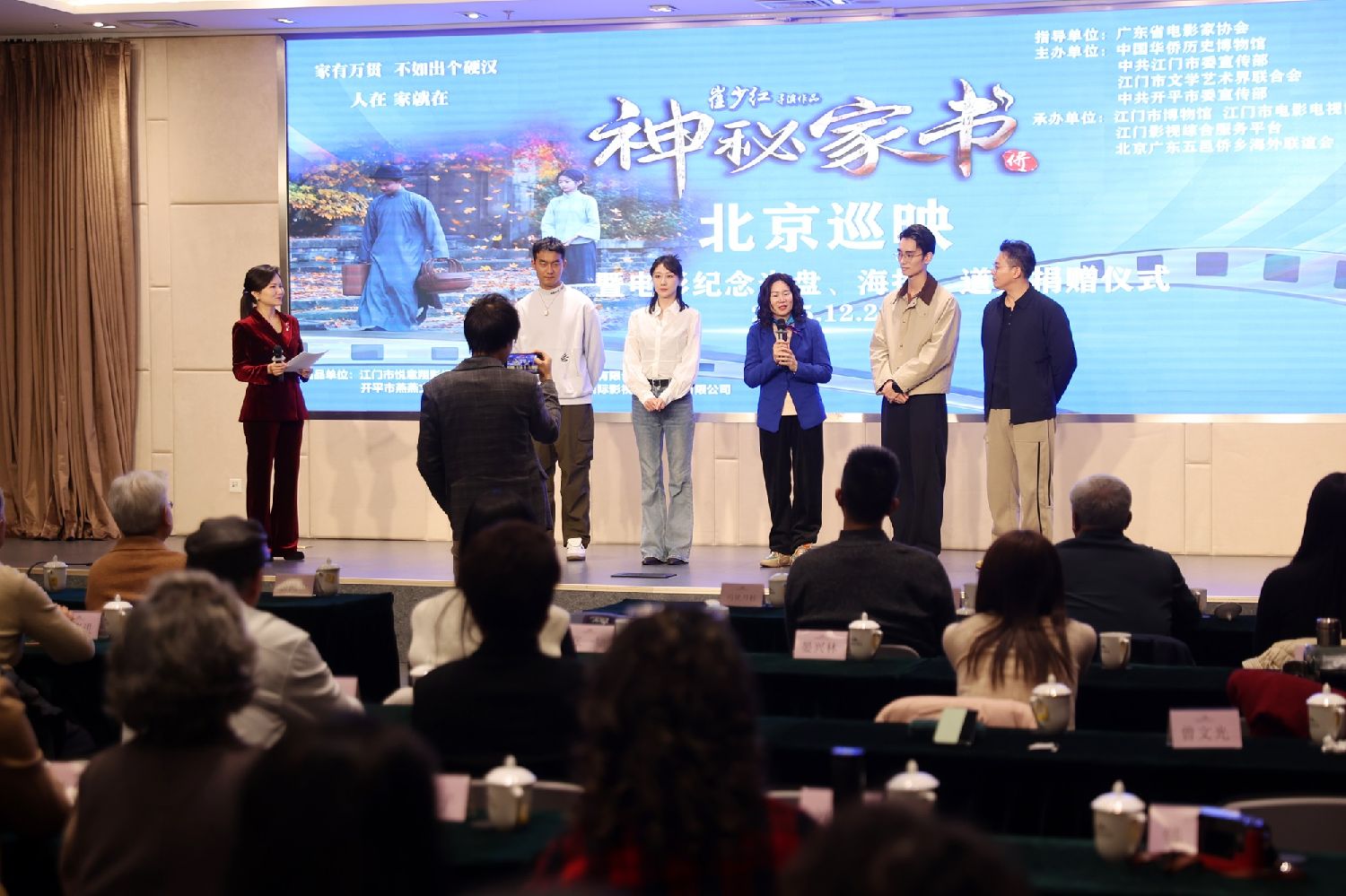 2025年12月23日,《神秘家书》主创团队在活动现场与观众互动。当日,影片《神秘家书》纪念光盘、海报、道具及文创品捐赠仪式暨北京巡映活动在中国华侨历史博物馆举行。(黎冯摄)