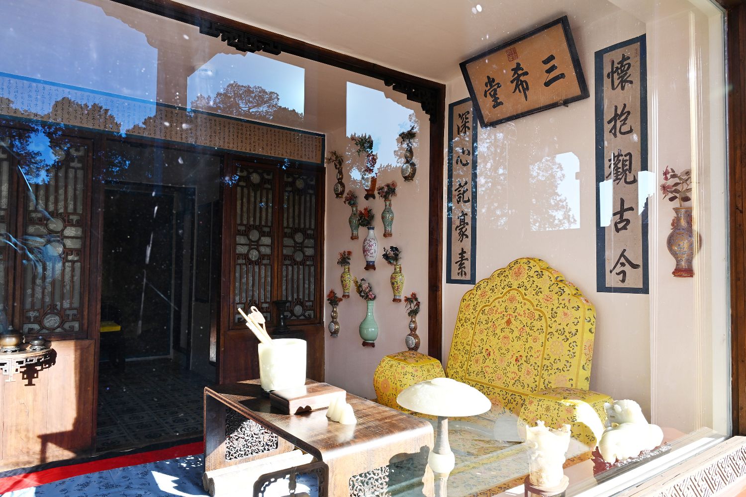 文明说,因为面积小,只有8平方米,而东西又特别多,所以恢复三希堂的原状陈列难度最大。墙上的壁瓶是三希堂一大特色,壁瓶里还插有各种宝石花,瓷器壁瓶和小宝石做的花都很娇贵,复原时小心翼翼,费了很大气力。