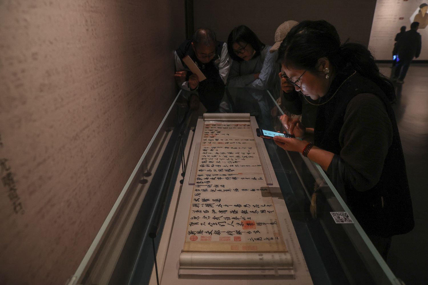 12月16日,“山谷雅集——黄庭坚诞辰980周年特展”在江西省博物馆开展,图为观众正在参观米芾《行书三札卷》。(图片来源:中新社)