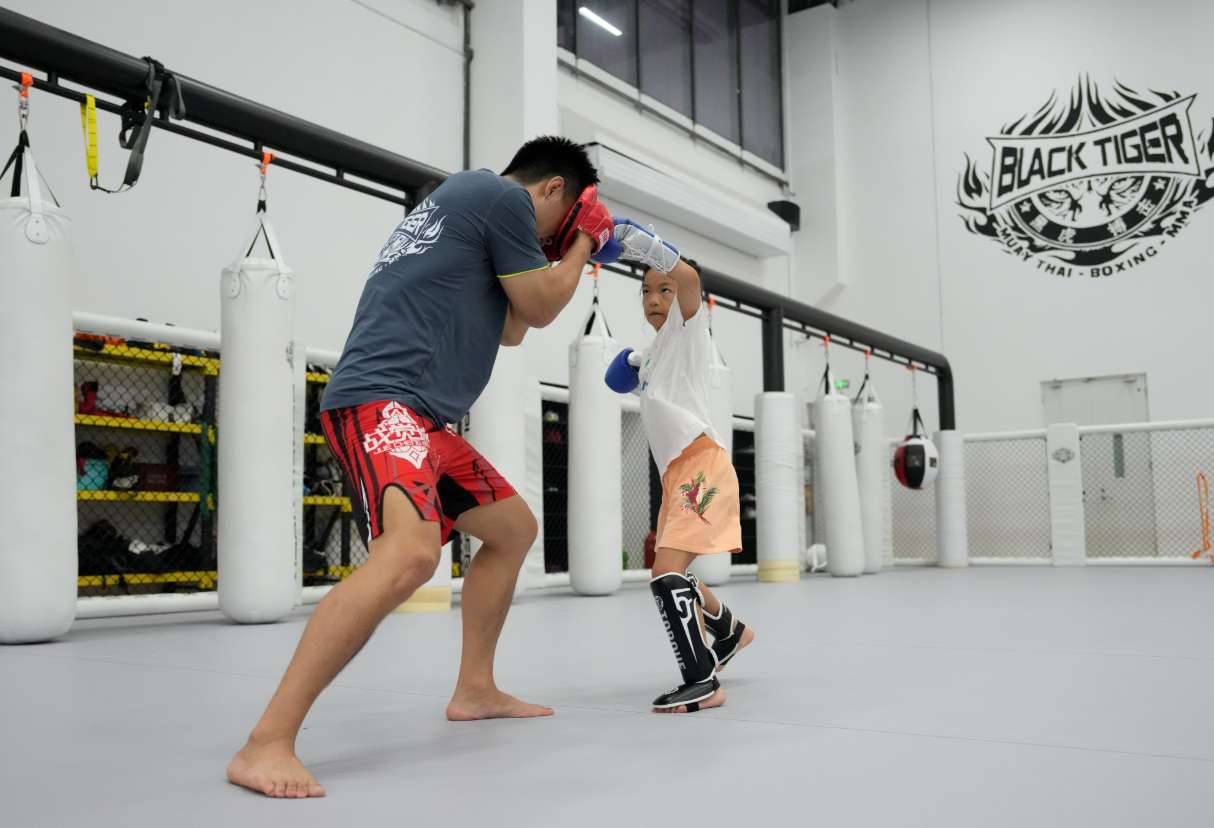 7月22日,在北京顺义良基科技广场,小朋友在练习搏击。(图片来源:中新社资料图)