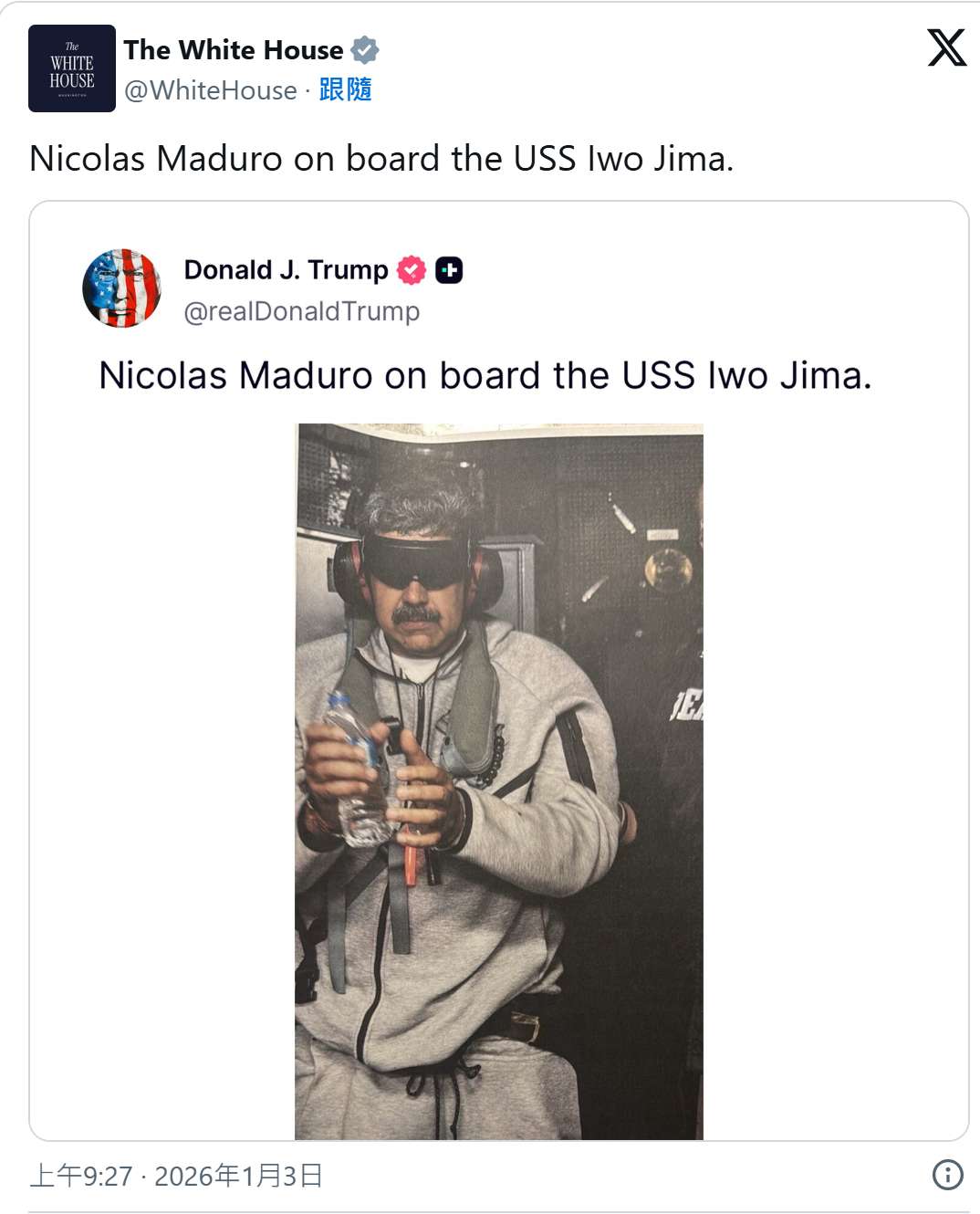 特朗普周六在佛罗里达州的海湖庄园俱乐部(Mar-a-Lago Club)召开记者会,解释这波行动的细节,他还通过自己的社交媒体真相社会(Truth Social)公布了美国两栖攻击硫磺岛号护送尼古拉斯·马杜罗的照片。
