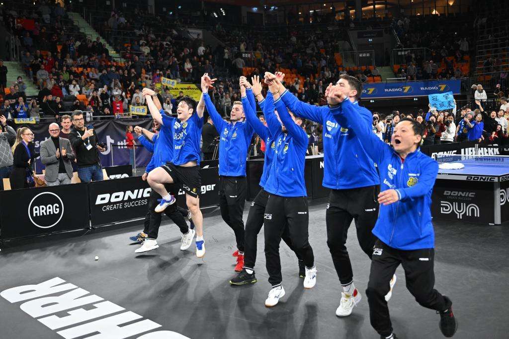 1月4日,樊振东和萨尔布吕肯队成员庆祝胜利。(图片来源:新华社)