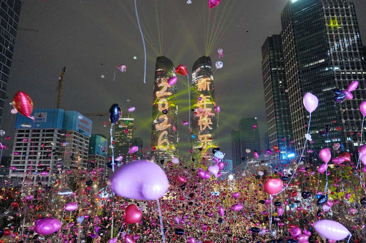 1月1日,“成都为你点亮”交子大道跨年活动在成都市高新区交子大道举行,活动以“以梦为马,‘心’耀蓉城”为主题,数万民众和游客来到天府双塔下迎接新年到来。图为民众天府双塔下迎接新年。(图片来源:中新社)
