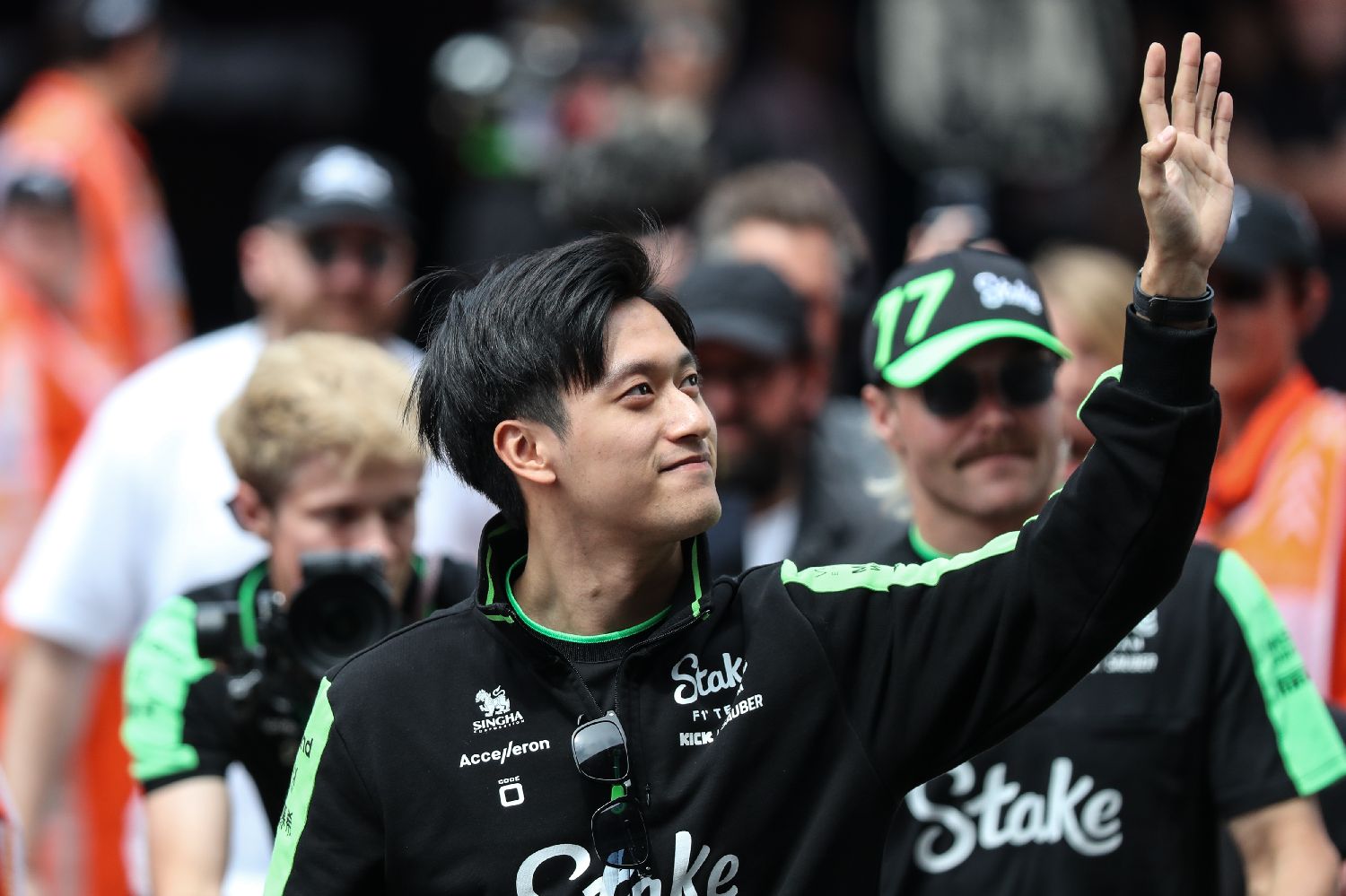 2024年4月21日,时任索伯车队车手的周冠宇在2024F1中国大奖赛上向观众挥手示意。(图片来源:中新社)