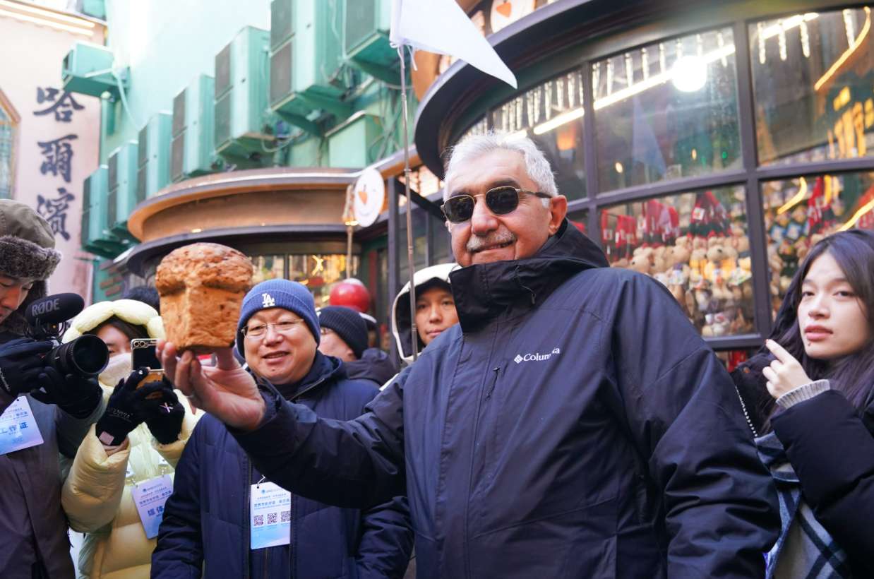1月7日,黑龙江哈尔滨,土耳其埃尔祖鲁姆大都会市副市长扎费尔·艾纳勒在中央大街了解美食。(图片来源:中新社)