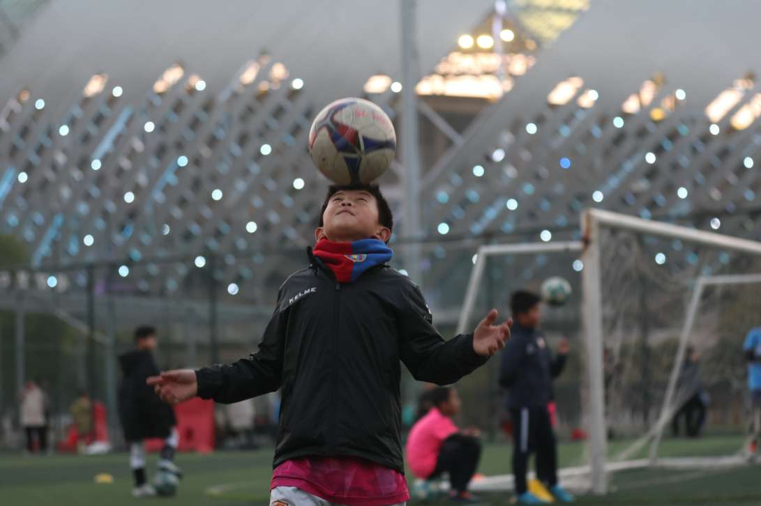 一名中国男孩正在练习用头部颠球。(图片来源:中新社资料图)