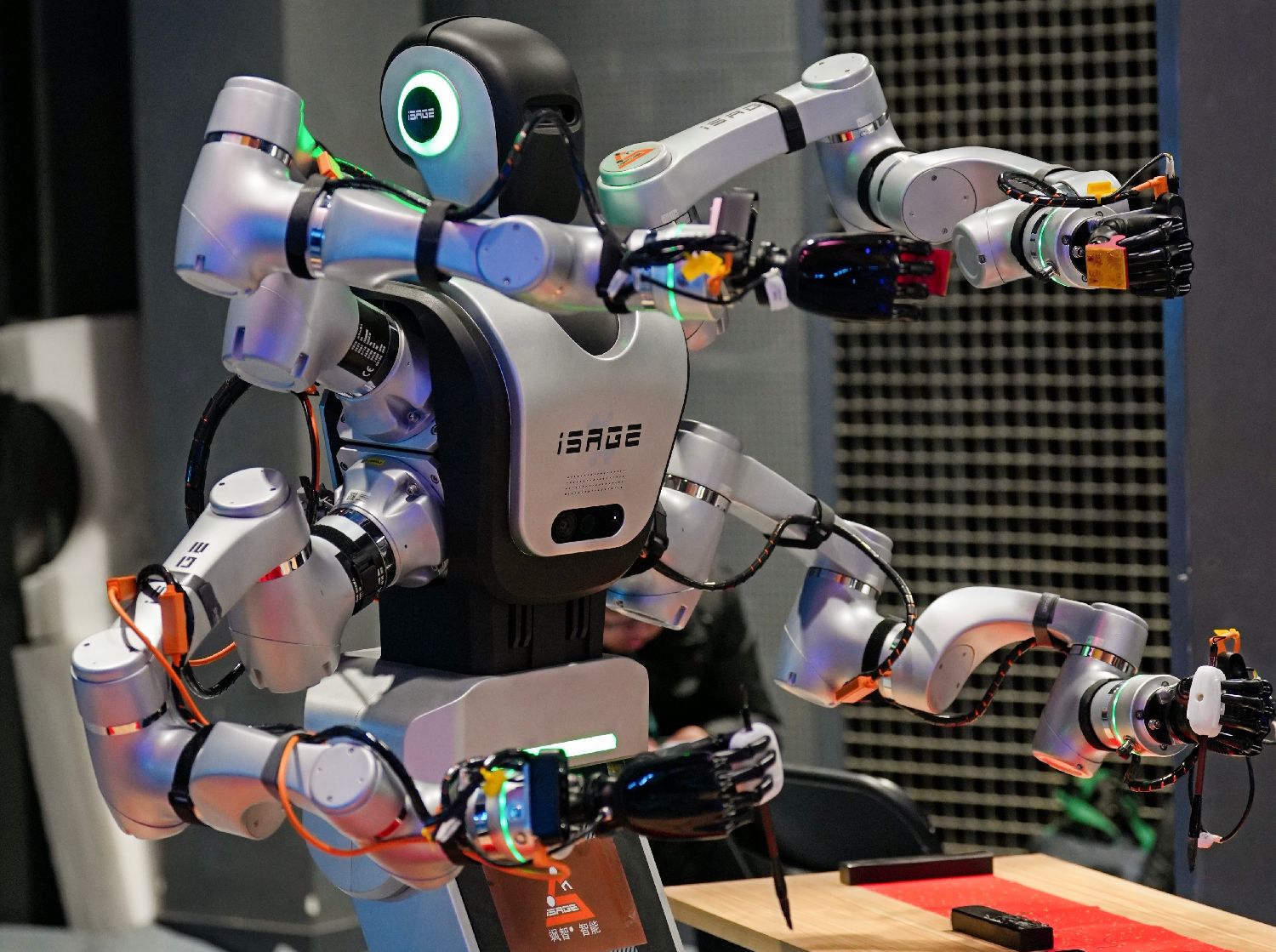 中新社报道,上海飒智智能科技有限公司(简称:飒智)的一款四臂机器人是今年大会的展示担当之一。据介绍,在汽车零部件等行业,该四臂机器人可同时进行多工位精密组装与实时质检,比如一手固定、一手操作、一手检测、一手传递。