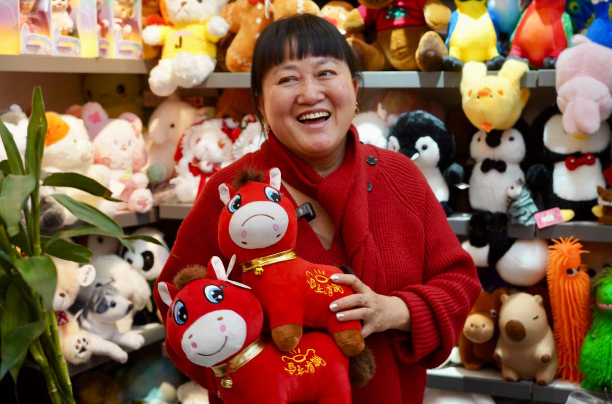 1月11日,浙江义乌商户张火清展示“笑笑马”和“哭哭马”。(图片来源:中新社)