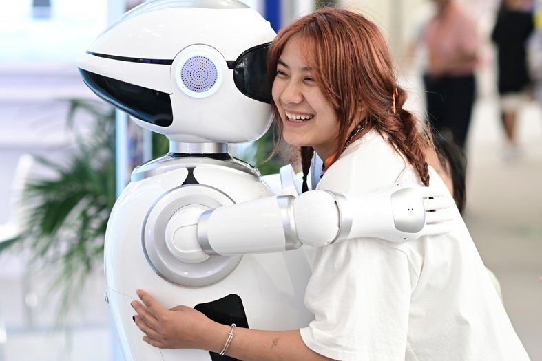 中国参观者在北京与机器人拥抱。(图片来源:中新社资料图)