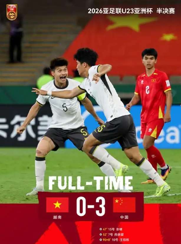 【本报讯】北京时间21日凌晨,在沙特阿拉伯吉达举行的2026年亚足联U23男足亚洲杯半决赛中,中国队以3:0战胜越南队,队史首次闯入该项赛事决赛,24日将与卫冕冠军日本队上演终极对决。