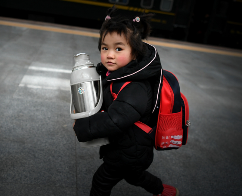一位中国小女孩抱着热水瓶,走在春节返乡的路上。(图片来源:中新网资料图)