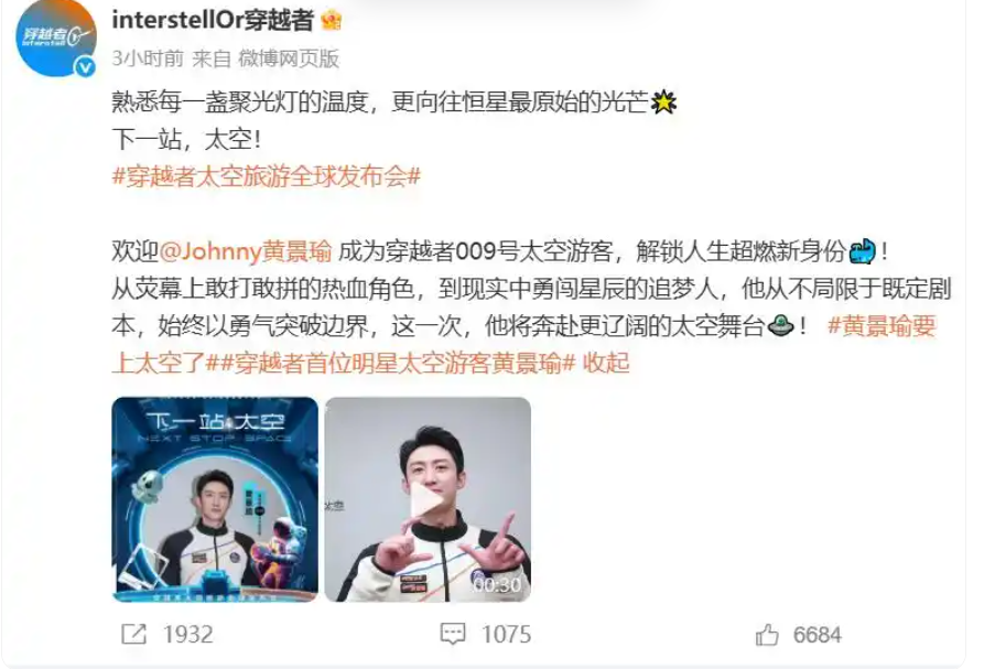 当天,“穿越者”官宣了黄景瑜成为009号太空游客。