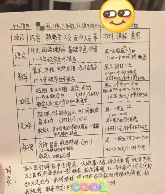 大陆央视新闻客户端报道,发布“求职广告”的人是来自浙江杭州的程女士,她讲述,这是儿子尧哥五年级时写的。当时,尧哥不小心打碎了家里的液晶电视屏,面对6000元(人民币,下同)的换屏费,他决定“创业”赚钱。