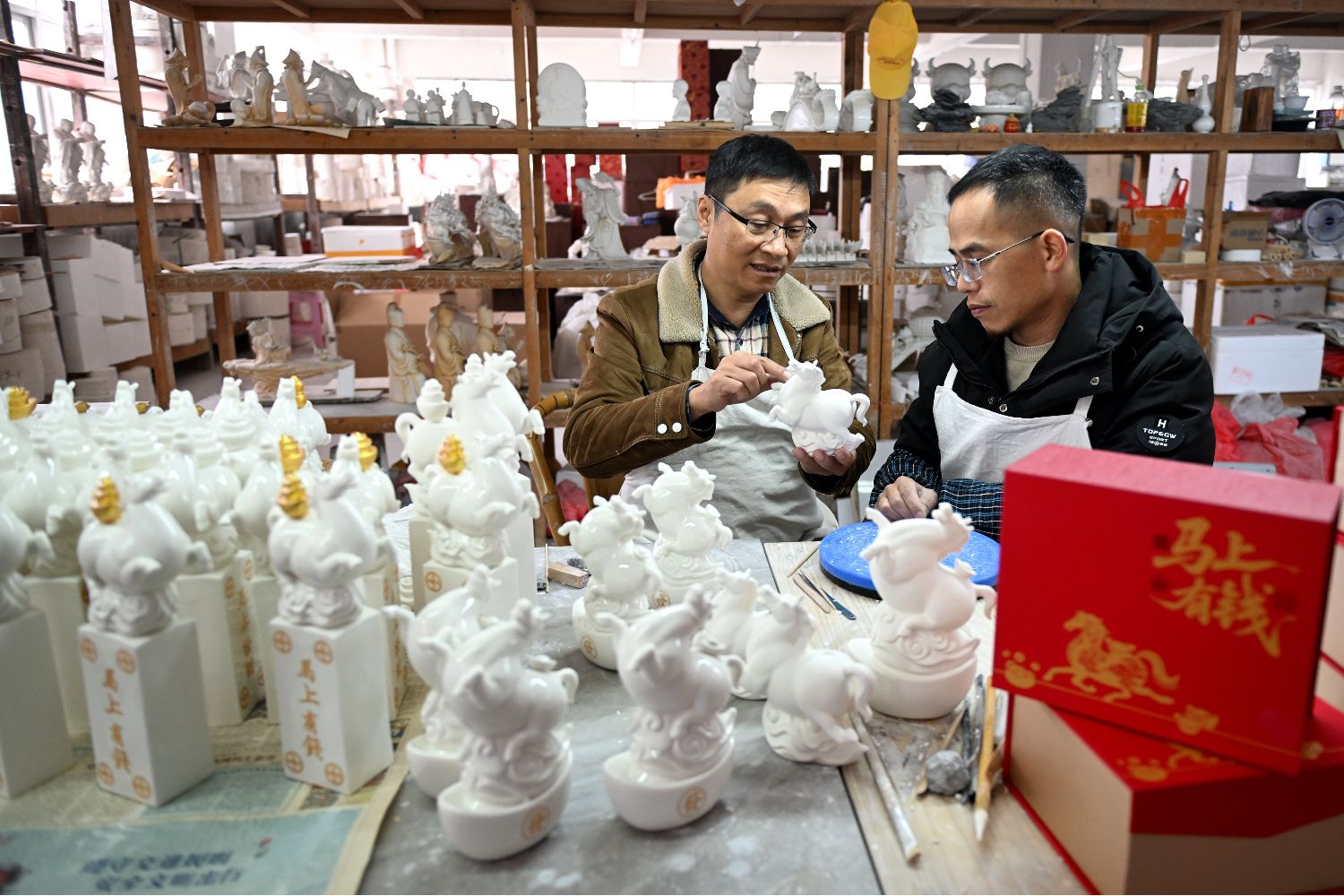 1月23日,福建省工艺美术大师周德健(左)与工人在永成瓷雕坊工作室制作生肖瓷。(图片来源:中新社)