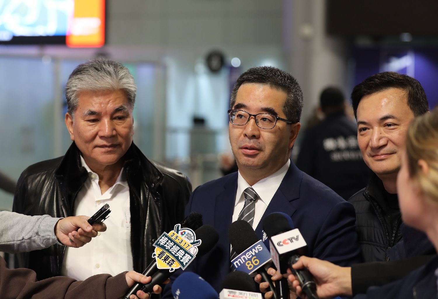 萧旭岑(中)2日出发前在桃园机场会见媒体。(图片来源:中新社)