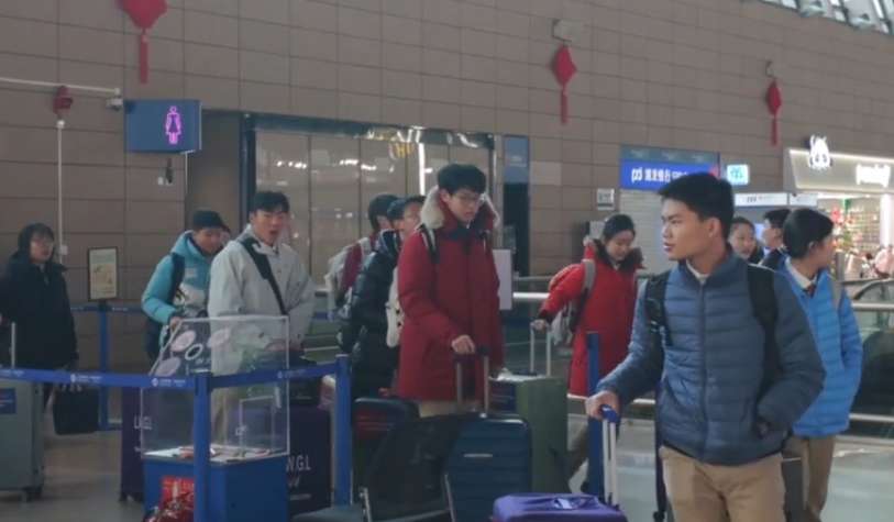 2月3日的上海浦东机场,一群身着上海市卢湾高级中学校服的青少年正在办理登机手续。(图片来源:中新社)