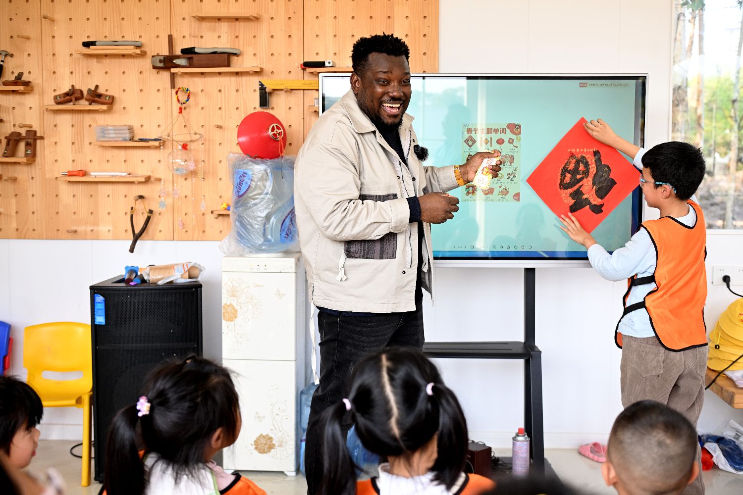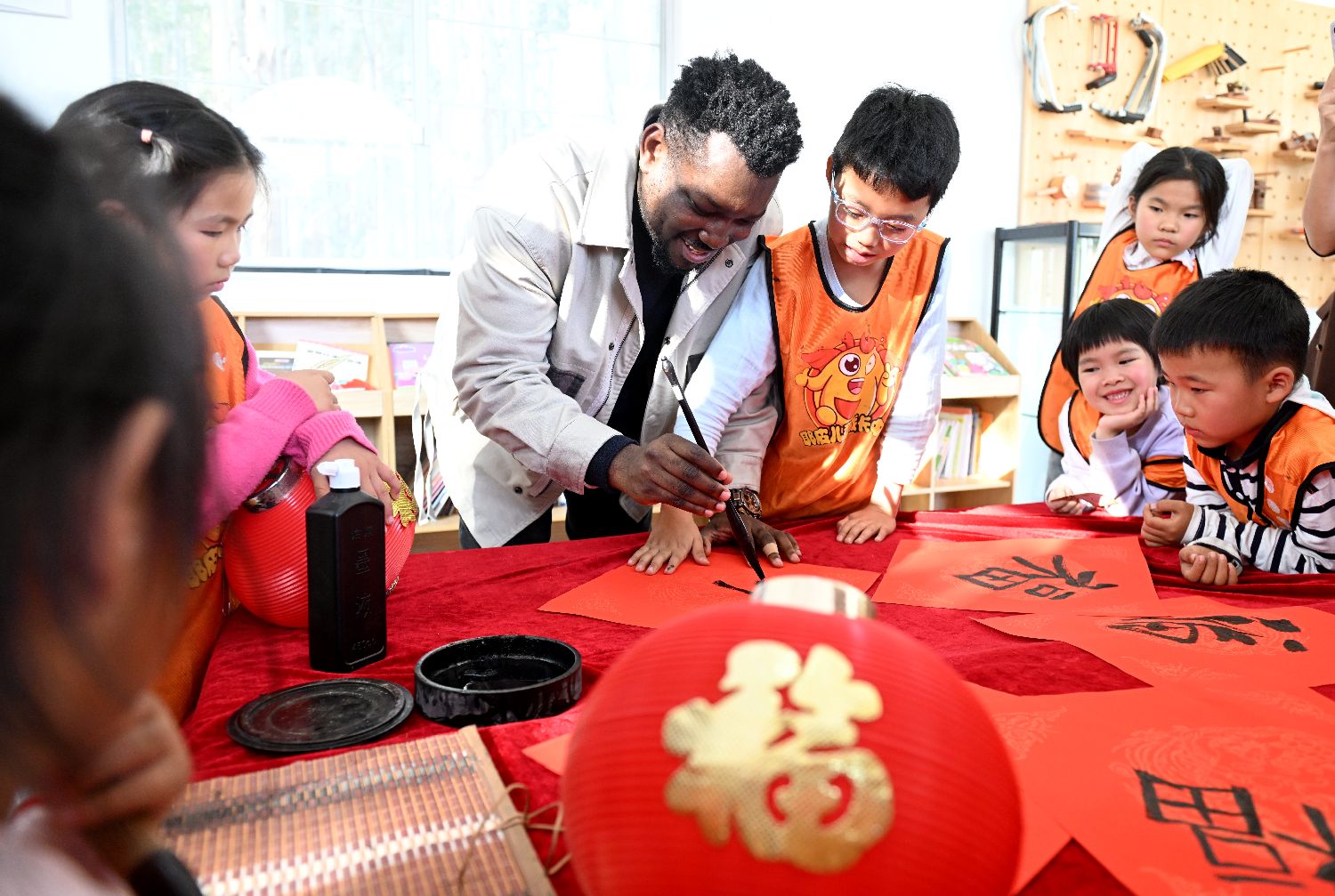 2月3日,“网红”青年外教珠峰(Joe)在福建省漳州市漳浦县的耶皮森林户外营地里,和孩子们一起写“福”“马”“春”等字。(图片来源:中新社)