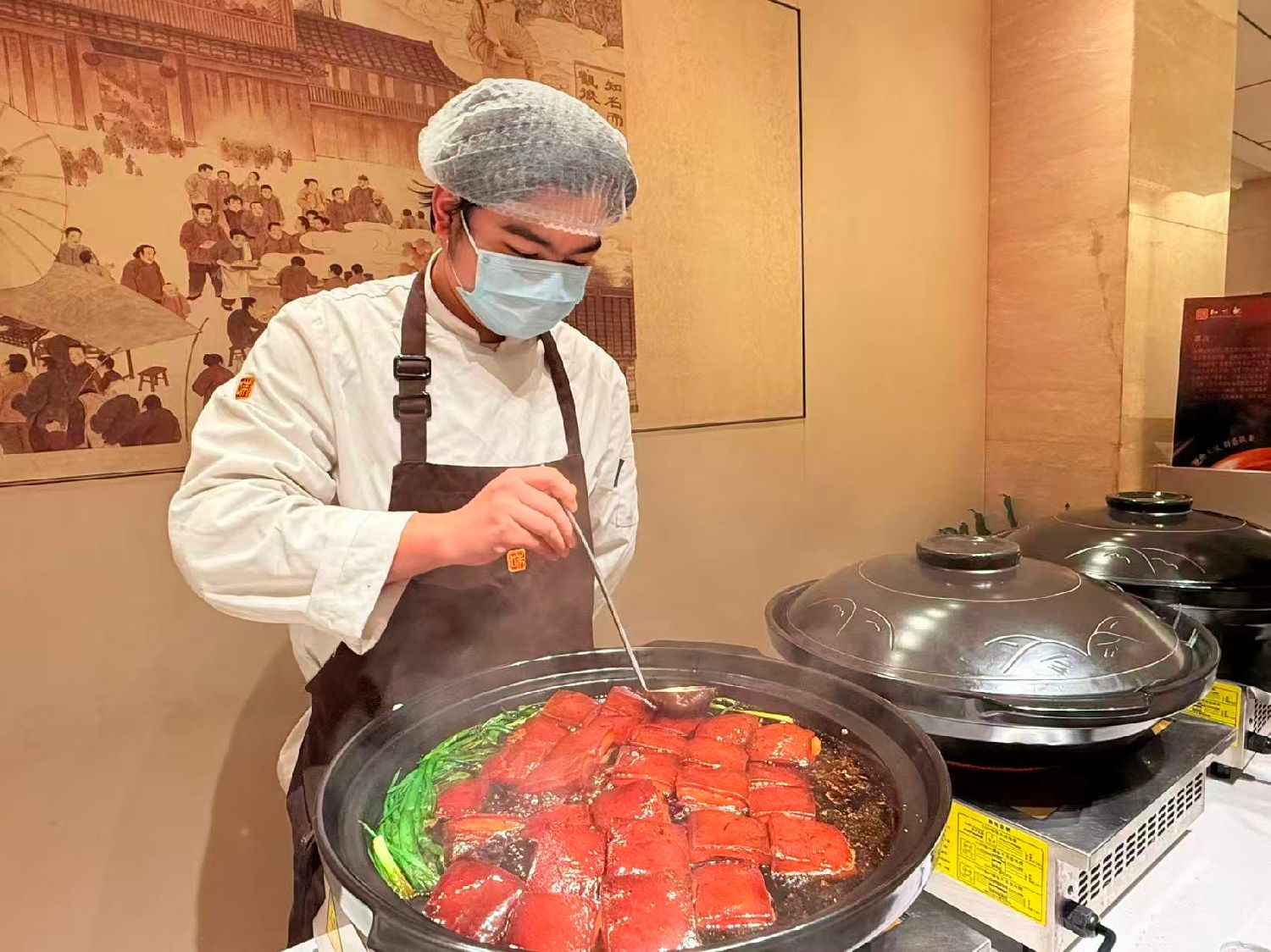 2月5日,在杭州知味观总店,厨师正在精心烹饪“东坡肉”,这道菜也是往年春节期间最受欢迎的菜品。(图片来源:中新社)