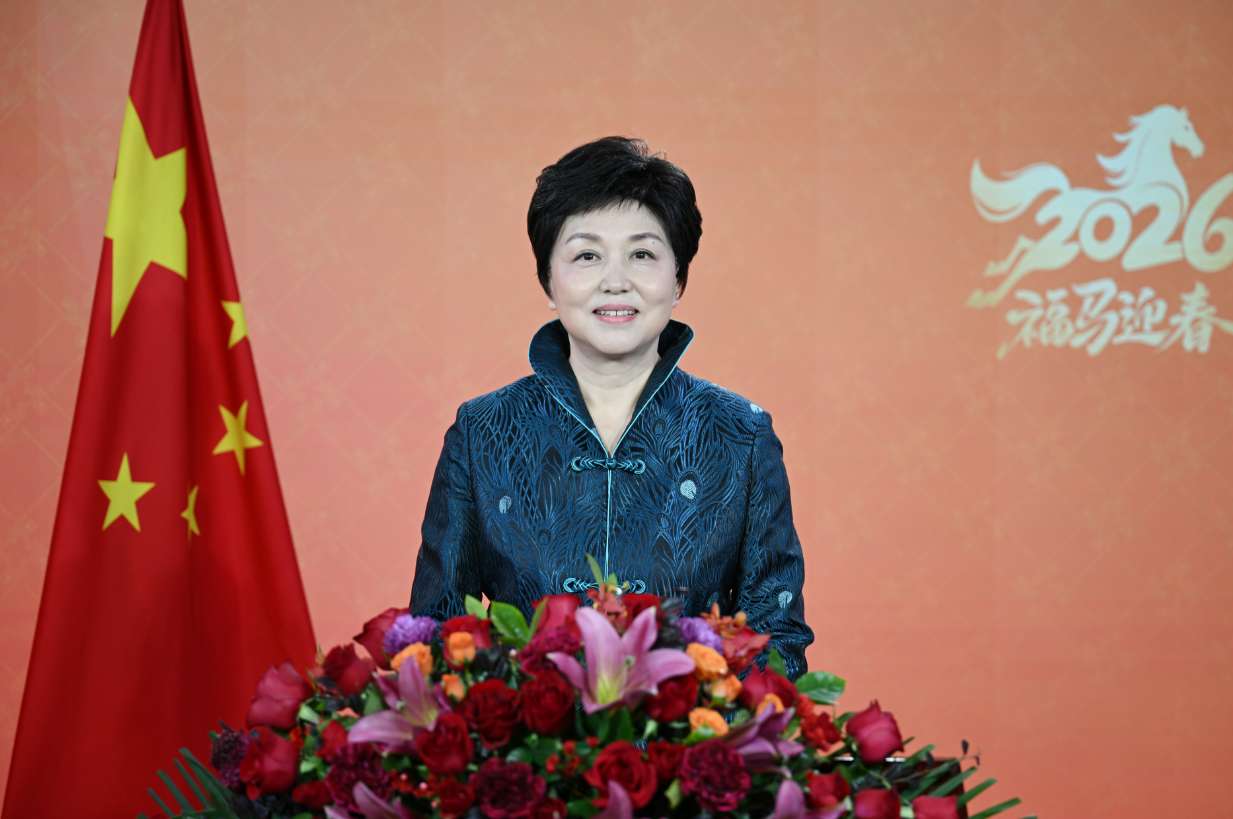 在中国农历马年春节来临之际,陈旭在北京发表新春贺词,向广大海外侨胞和归侨侨眷致以新春祝福。(图片来源:中新社)