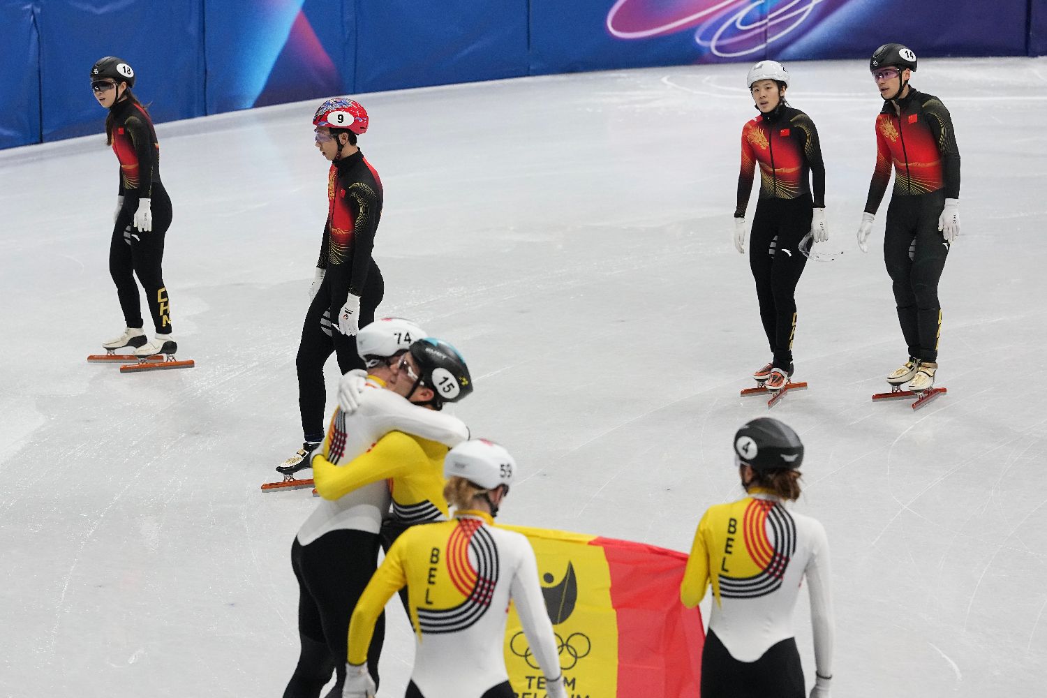 当地时间2月10日,米兰冬奥会短道速滑混合团体接力A组决赛在意大利米兰举行,中国队位列第四名,无缘奖牌。图为中国队在比赛后离场。(图片来源:中新社)