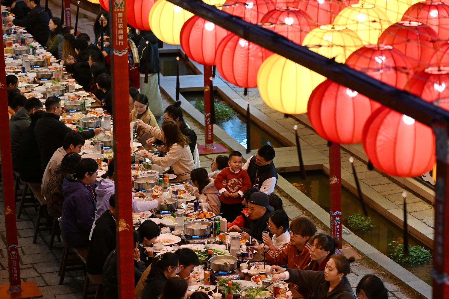 2月11日,逾两百人在泉州晋江梧林传统村落“围炉”共享团圆宴,沉浸式体验闽南年味。(图片来源:中新社)