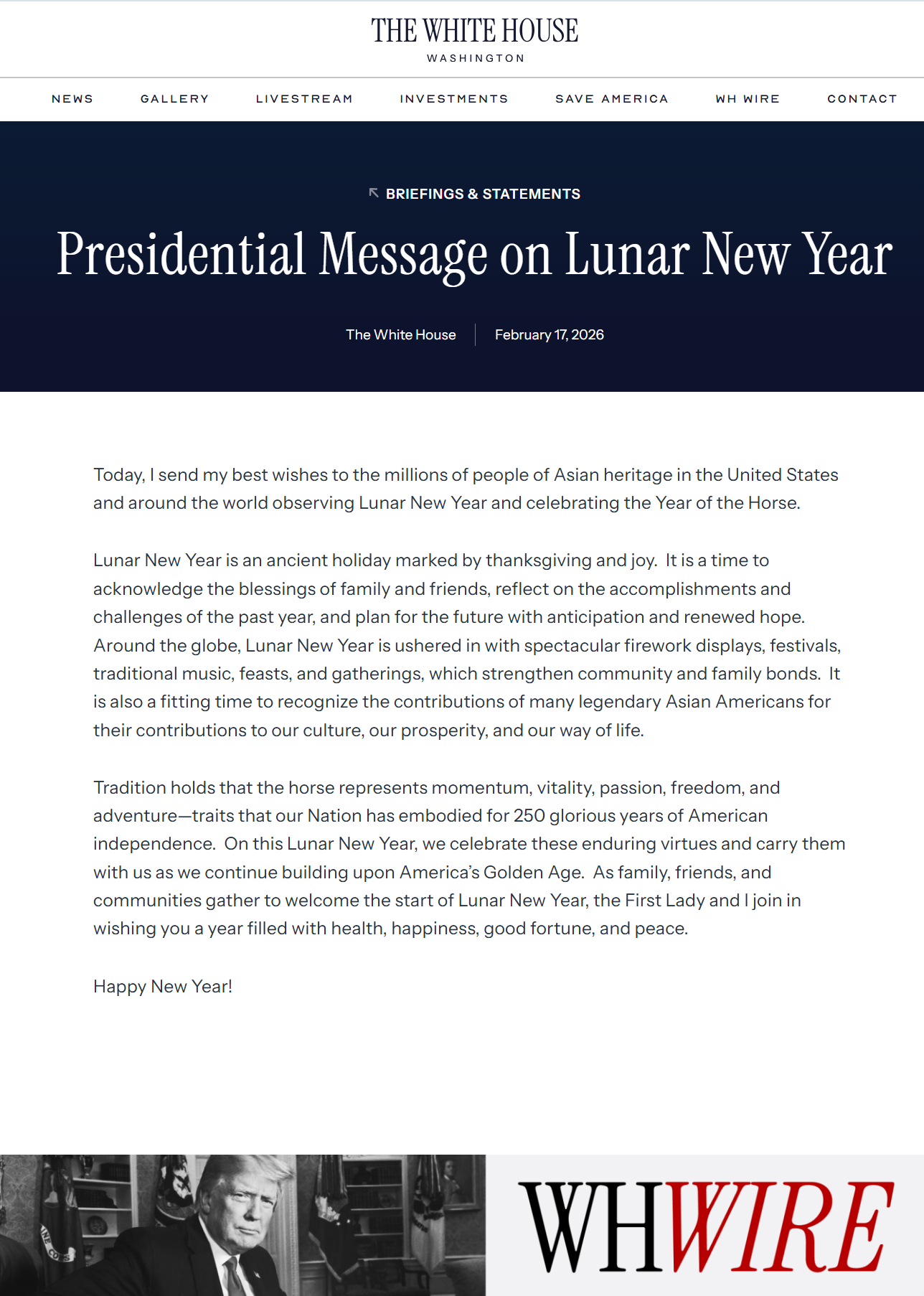 声明中,特朗普特别阐述了“马”的象征意义。他写道:“传统认为,马象征着动力、活力、激情、自由和冒险——这些特质正是我们国家在250年辉煌的独立历程中所体现的精神。”他表示,值此农历新年之际,将颂扬这些永恒的美德,并将它们铭记于心,继续谱写美国黄金时代的篇章。