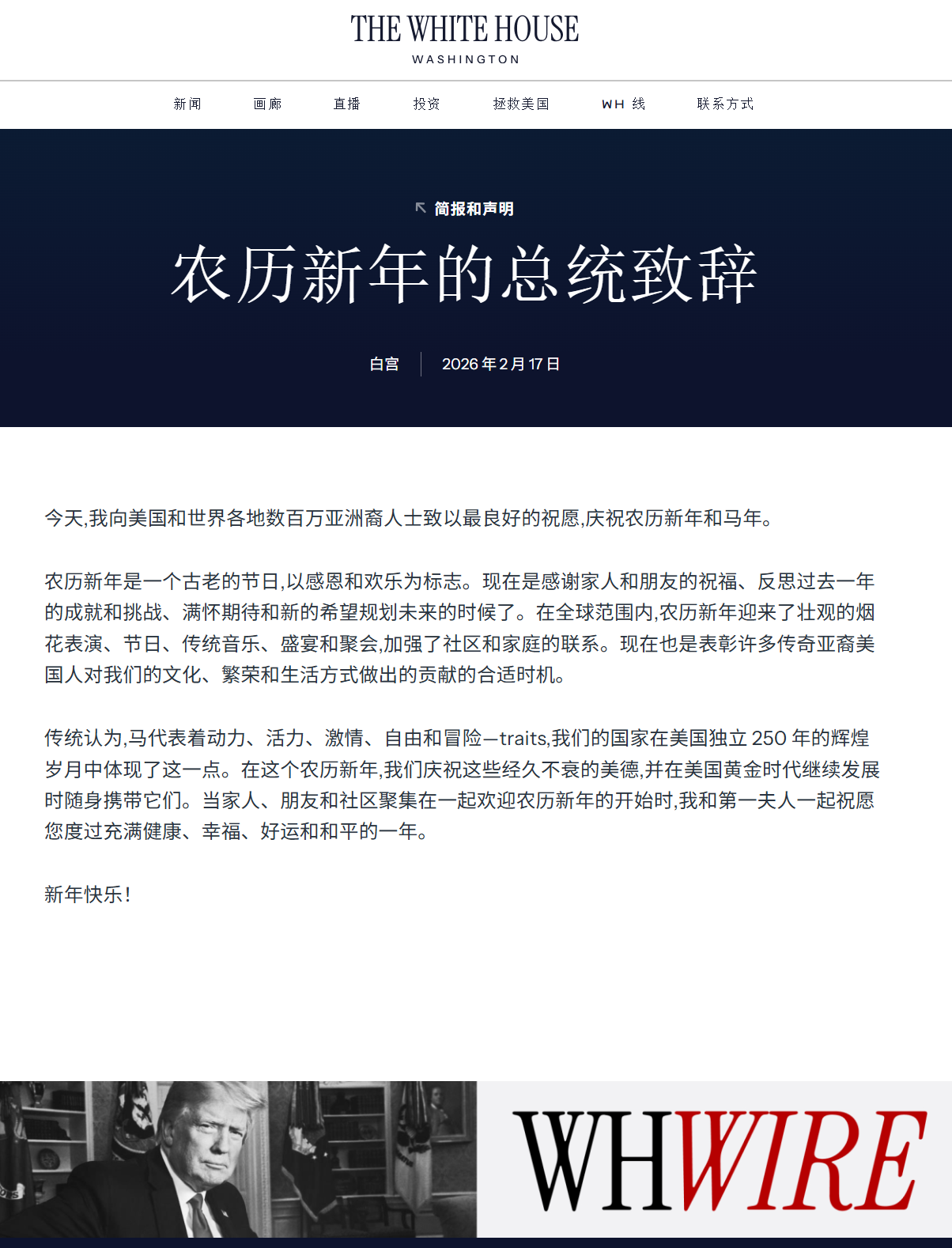 【本报讯】2月17日马年大年初一上午,白宫发布“农历新年的总统致辞”,全文如下:
