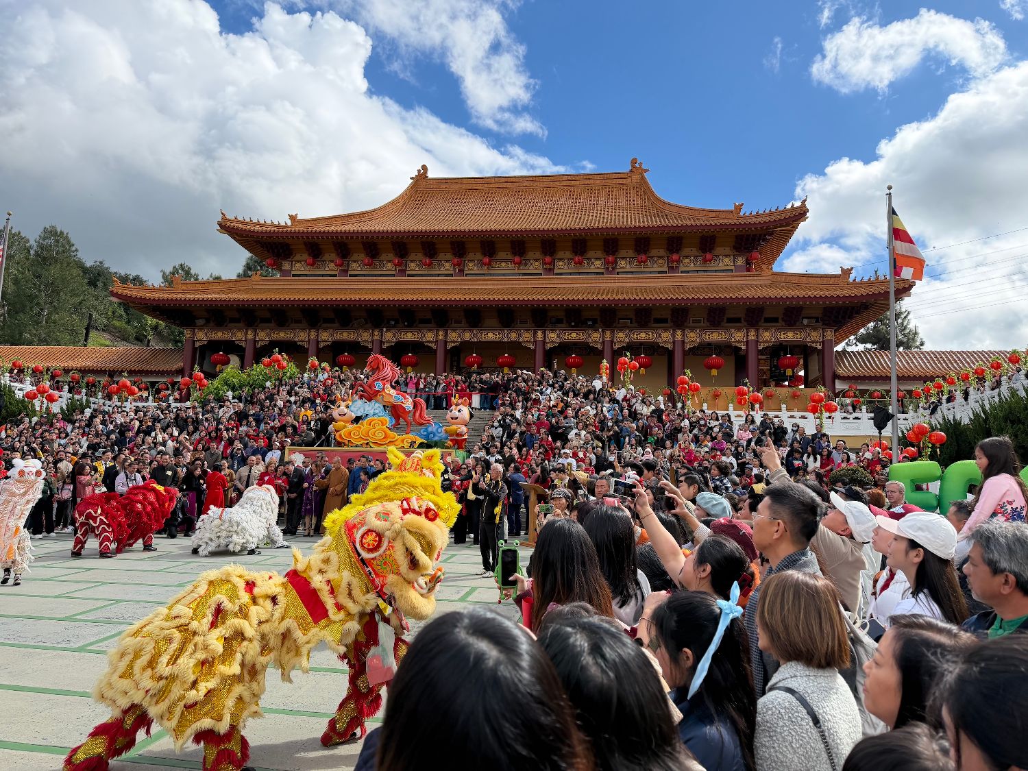 正午时分,慧东法师来到大雄宝殿前的成佛大道,同美国当地官员等各界来宾及年龄与肤色各异的数以千计民众一起观看舞狮等新春文艺表演。多位美国嘉宾用中文祝福大家“新年快乐、恭喜发财”,人们纷纷欢呼回应。马年春节平安灯、诸事圆满祈愿树、三好沙弥花灯和欢庆佛光山开山六十周年主题展示等景观,亦吸引众多游客拍照留念。