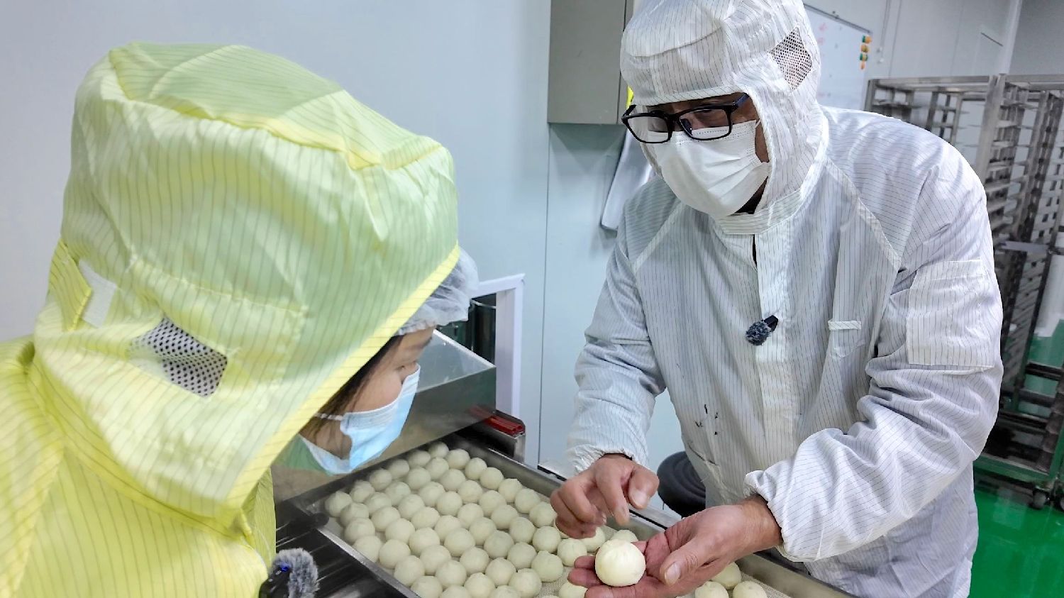 走进嵊州小笼包工厂,百余名工人忙碌在剂子室、包制区、蒸包间等,赶制春节前最后一批订单。在兑碱室里,64岁的华侨张瑞明身着防尘服、戴着口罩,双手沾满面粉,向老师傅虚心请教加碱技艺。