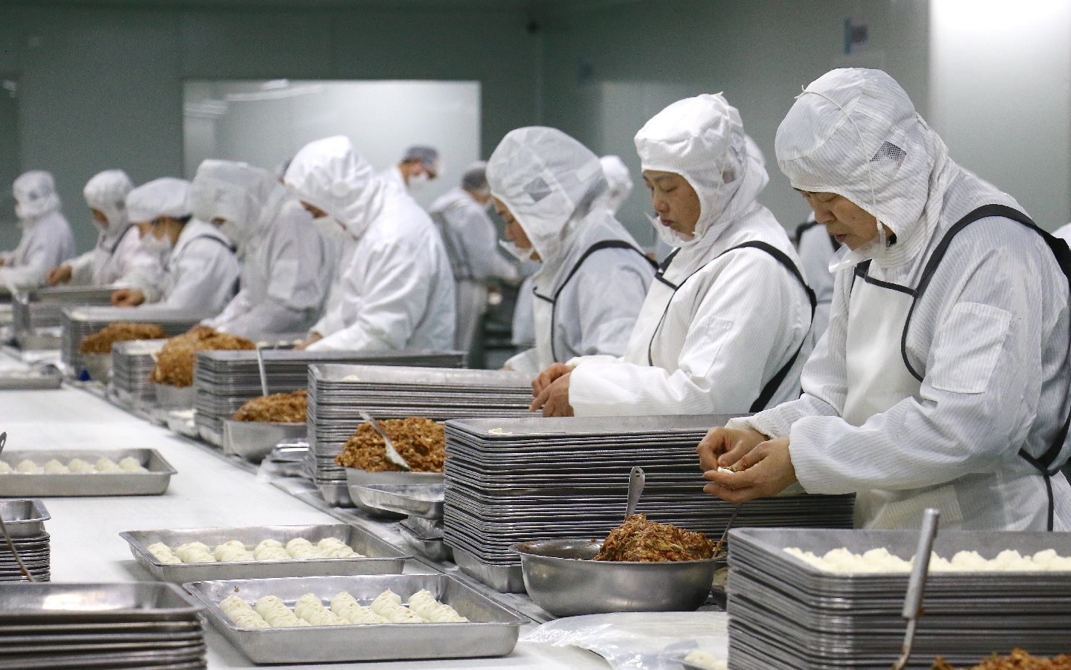 今年春节前夕,在浙江嵊州小笼包工厂,工人们手工包制小笼包。(图片来源:中新社)