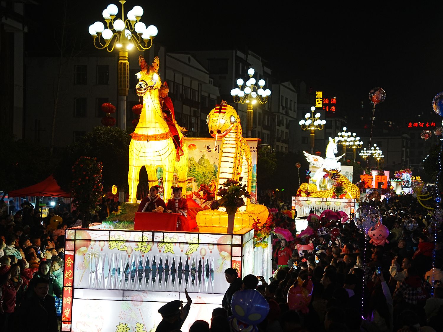 2月25日晚,民众在贵州省施秉县城观看花车和龙灯巡游展演。(图片来源:中新社)