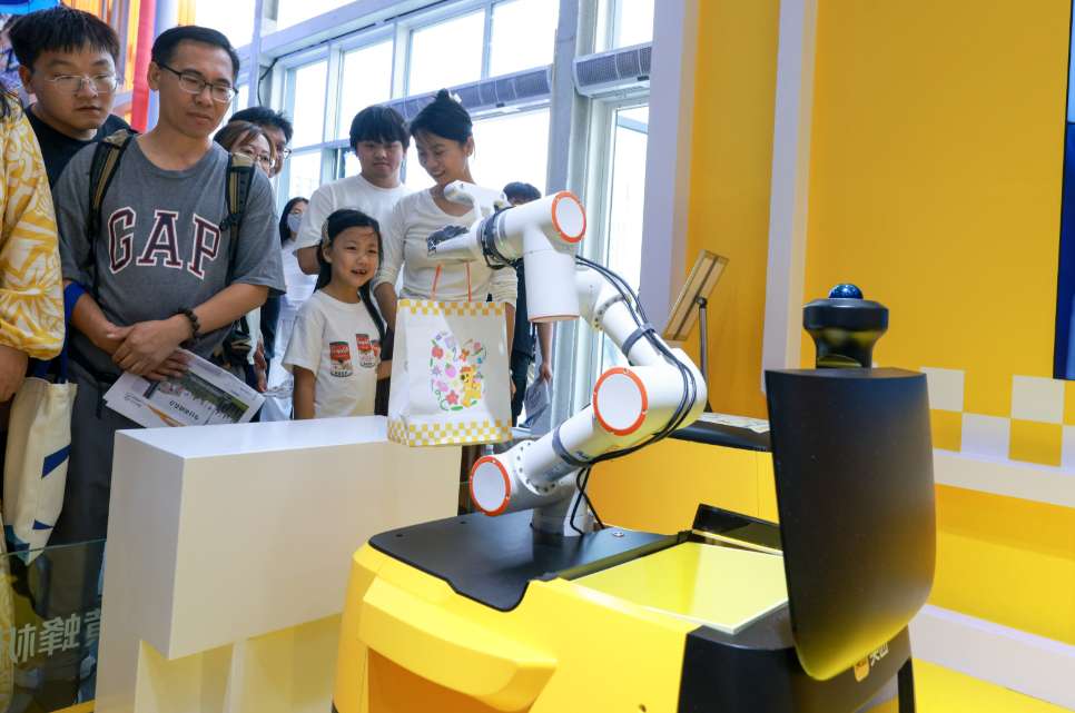 在北京首钢园举行的2025年中国国际服务贸易交易会上,观众参观外卖配送机器人。(图片来源:中新社资料图)