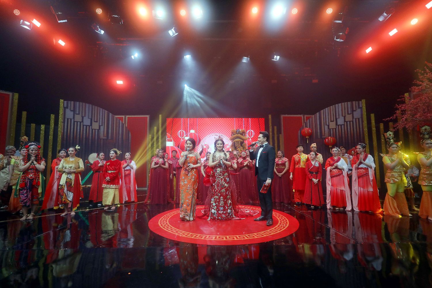 晚会在印尼华语歌手黄佳佳与合唱团合唱《恭喜恭喜》的旋律中落幕。(完)