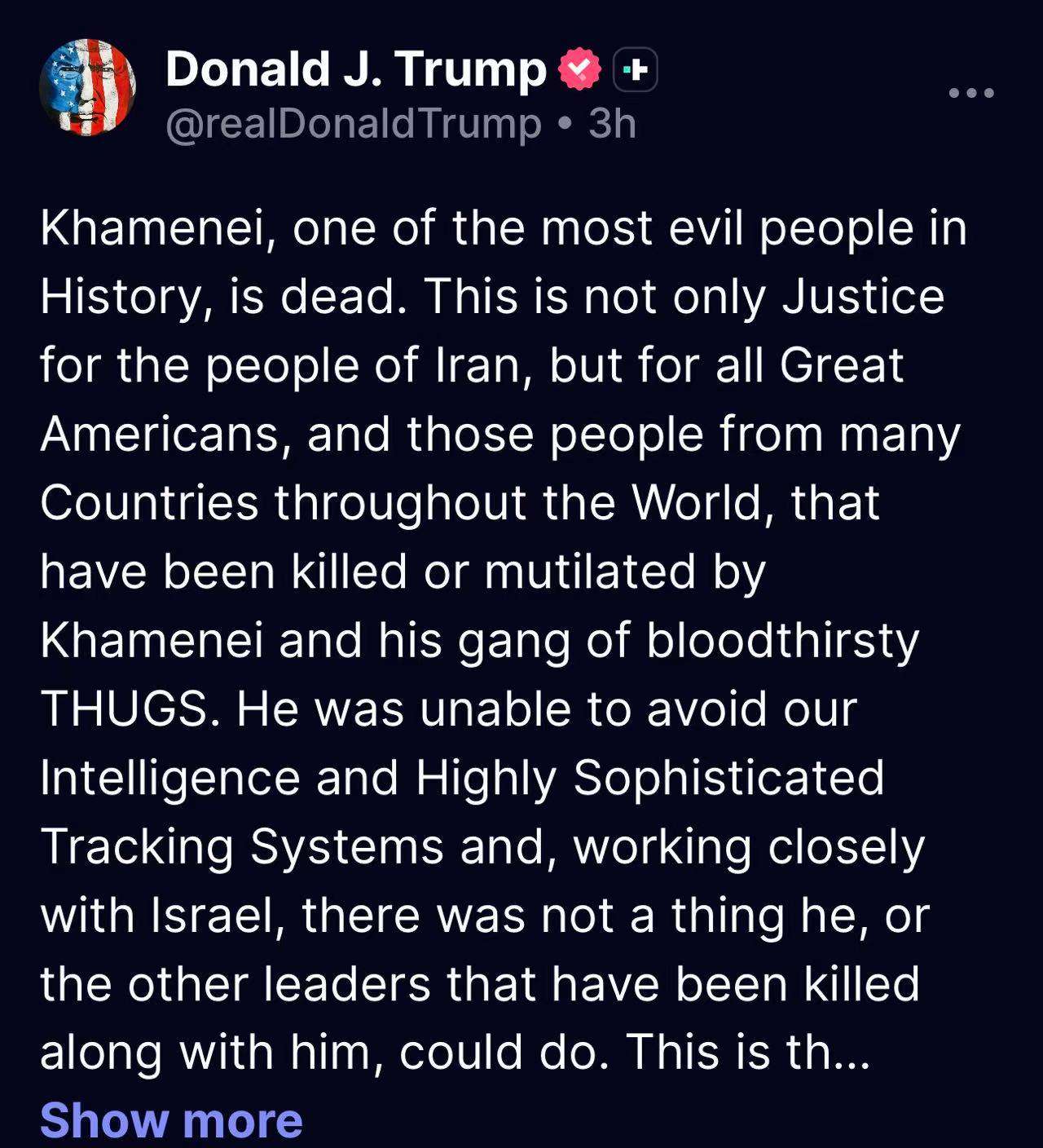 美国总统唐纳德·特朗普在Truth Social平台上宣布“重大作战行动”已启动,并确认哈梅内伊在以色列支持下的美以打击中被击毙。特朗普称哈梅内伊为“历史上最邪恶的人之一”,并表示轰炸将“毫不间断地持续一周或必要的时间”,以实现“中东乃至全世界的和平”目标。他强调,美国情报和先进追踪系统确保了行动的精准性,并呼吁伊朗人民抓住机会推翻政权,建立更稳定的过渡。