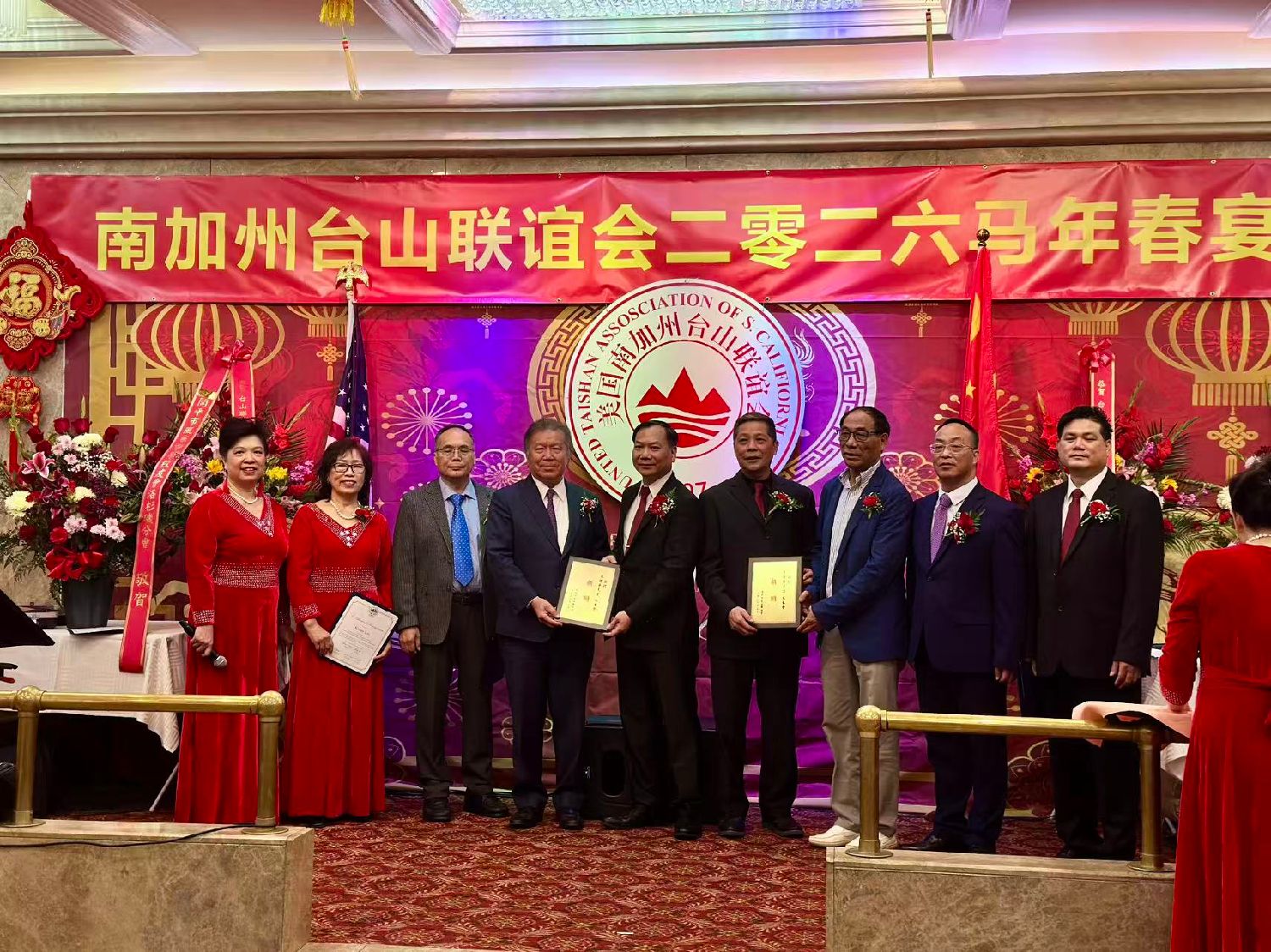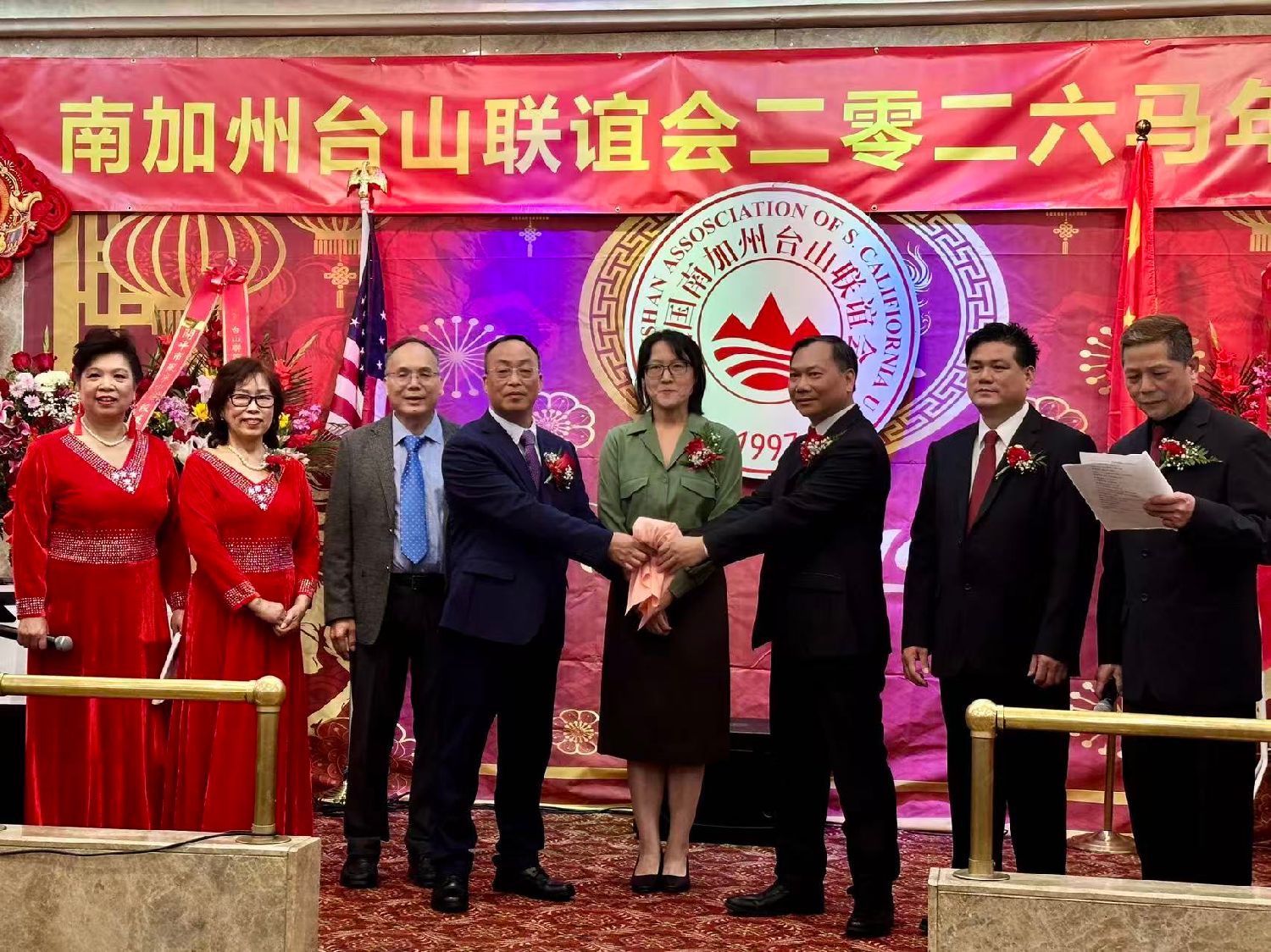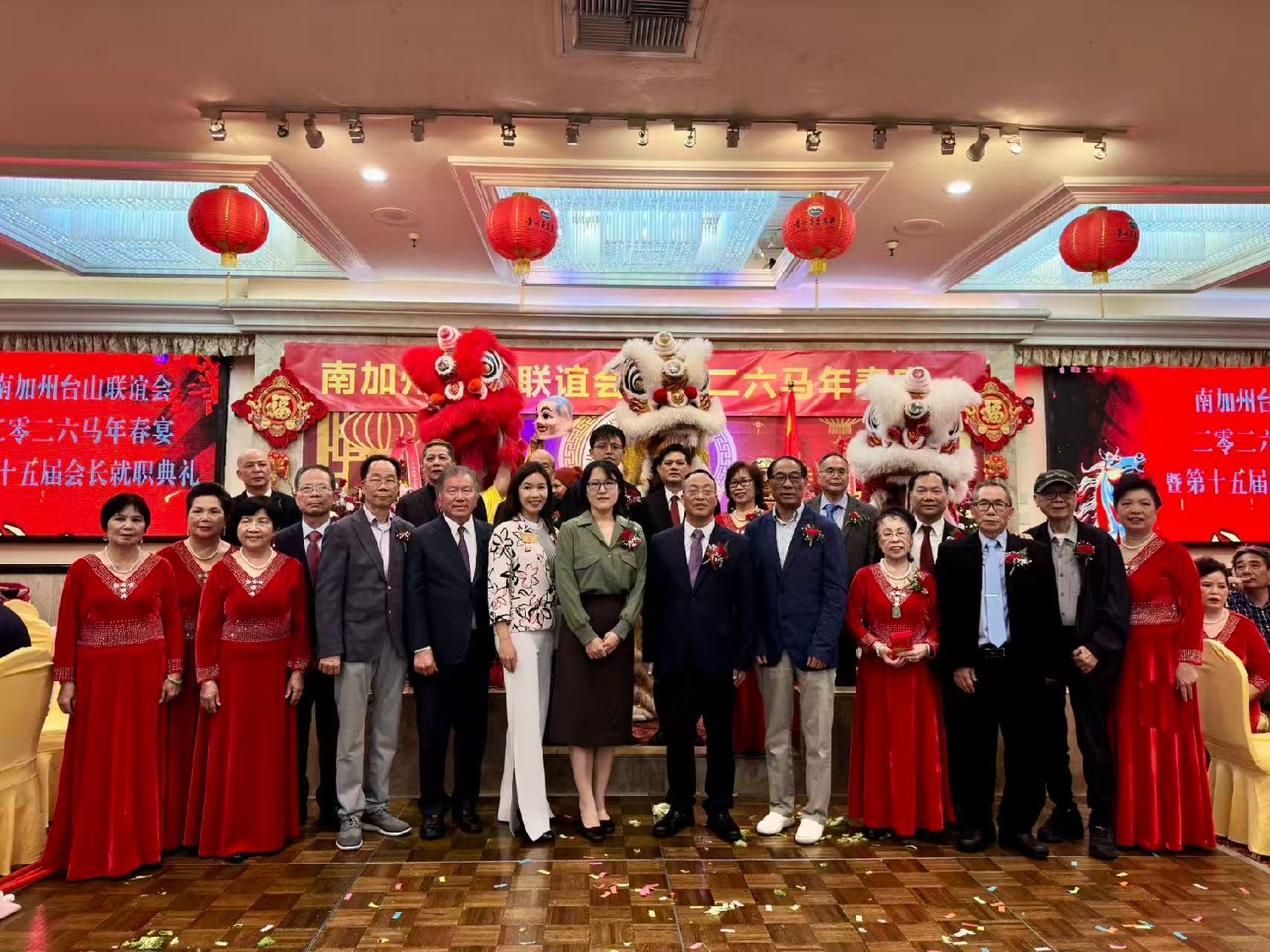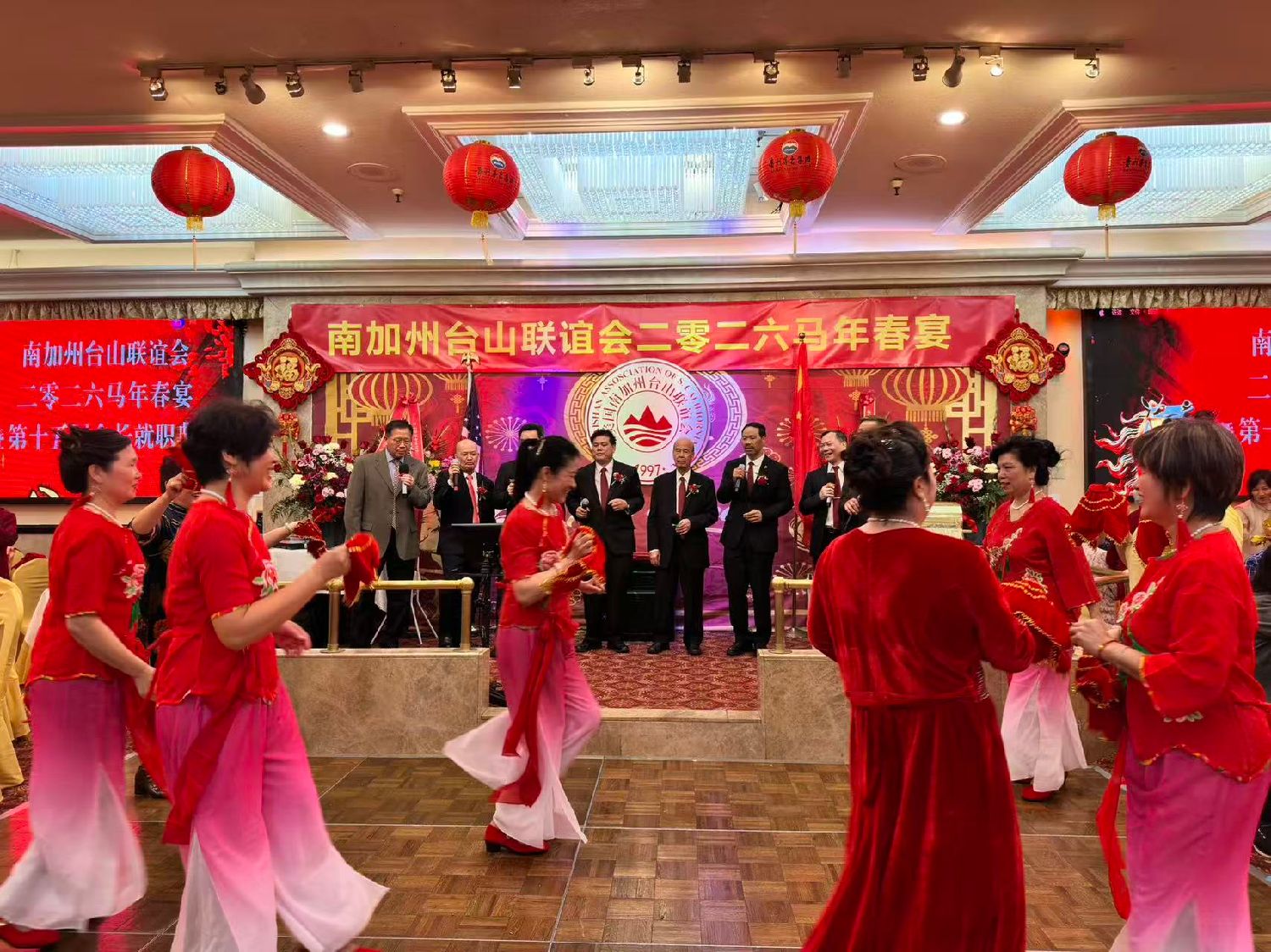 【本报讯】记者甄松伟报道,2月28日晚,南加州台山联谊会假座蒙特利公园市NBC海宝潮粤酒家举行2026马年春宴暨第十五届新会长就职典礼。