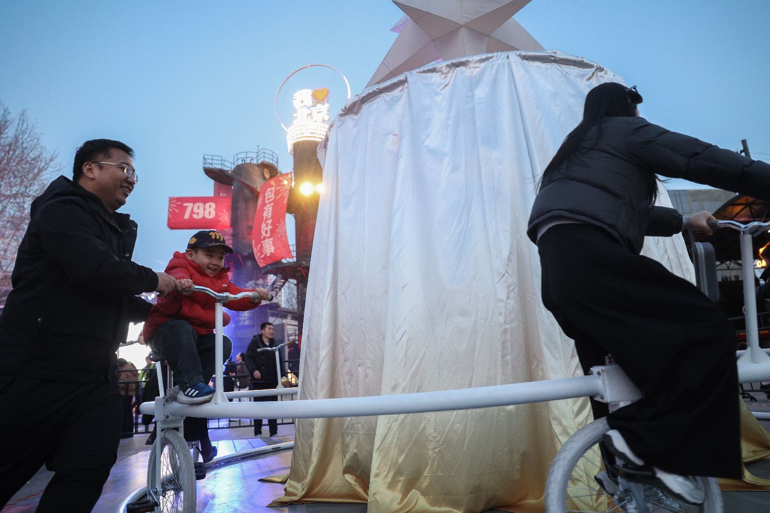 3月3日,游客带着孩子在艺术区游戏区与装置互动,欢闹元宵节。(图片来源:东西问客户端/李国庆摄)
