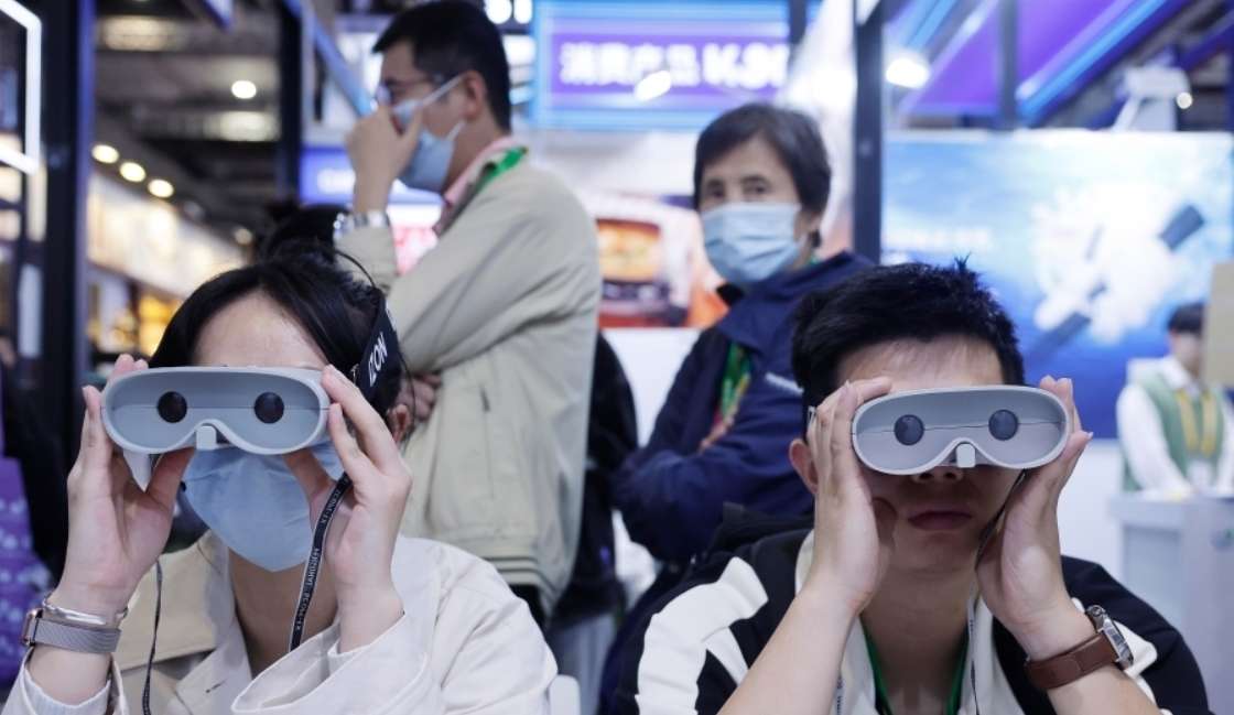 2025年11月8日,第七届进博会消费品展区,观众体验视力矫正仪。(图片来源:中新社资料图)