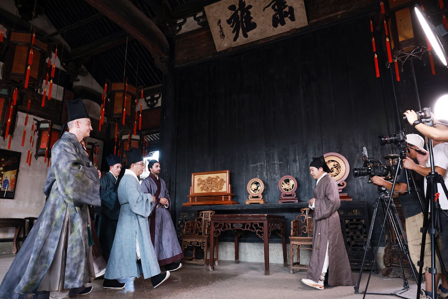 2025年8月24日,在浙江金华东阳卢宅景区,国际友人穿古装戏服,背台词、走机位……本次活动是2025“相聚浙里”国际人文交流活动的系列活动,邀请部分外籍博主和友好使者参与以东阳木雕为主题的微短剧拍摄。(图片来源:中新社)
