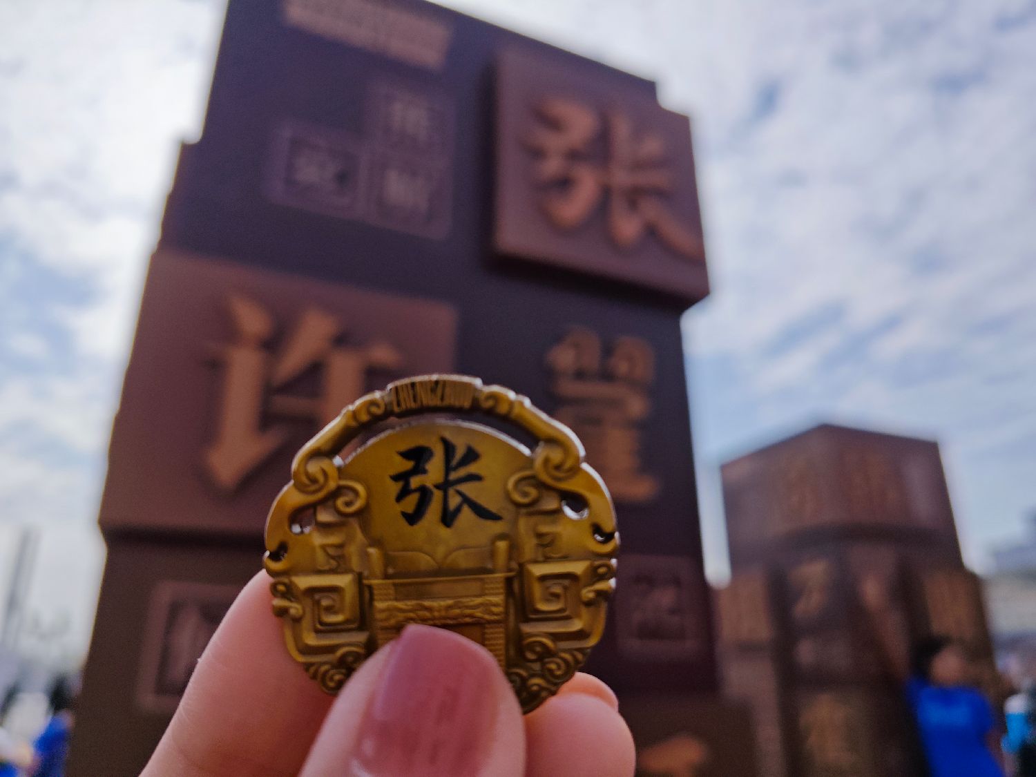 2025年11月15日,河南郑州,2025郑州马拉松开跑前,参赛选手在姓氏墙前展示姓氏元素纪念牌。(图片来源:中新社)