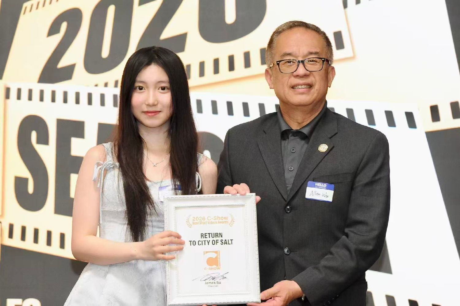 •核桃市市长伍立伦为《RETURN TO CITY OF SALT》主演Joy Long颁发“最佳微视频奖”