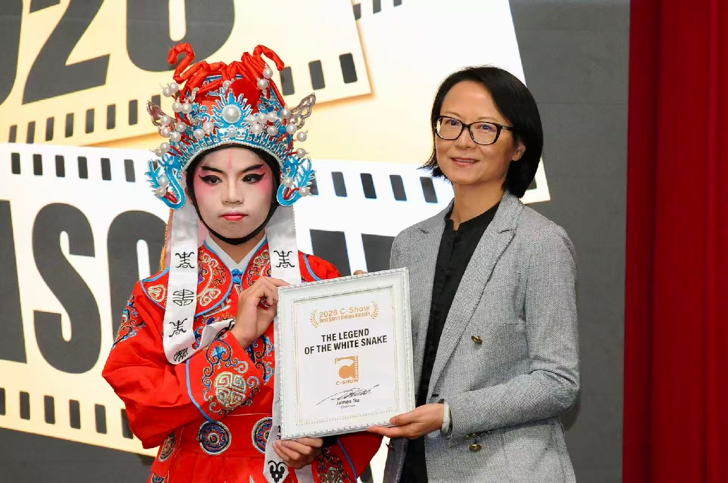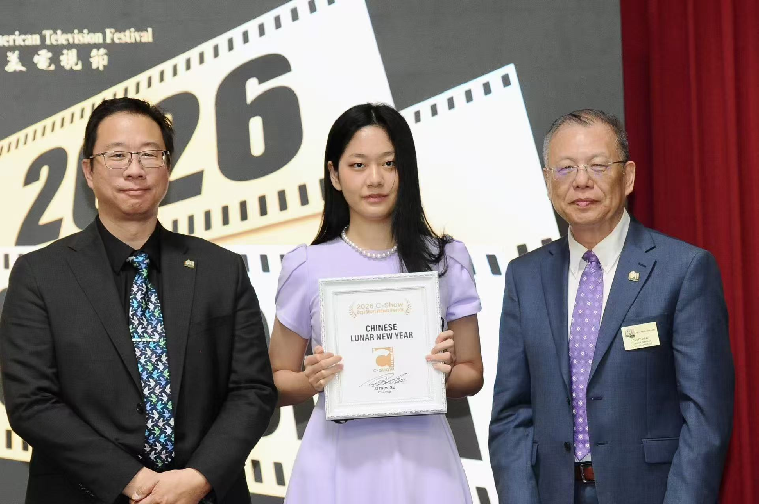 凭借卓越的艺术表现力与长期的社区服务,获奖作品《I LOVE YOU,CHINA》的表演者Chelsea Snow不仅荣获最佳微视频奖,更被授予“2026C-Show青年大使”荣誉称号。中美电影节|中美电视节主席、美国鹰龙传媒公司董事长苏彦韬为其颁奖。Chelsea Snow表示:C-Show不仅是一个平台,更是一座连接中美青年心灵的桥梁。荣获青年大使的肯定不仅是个人荣誉,更是鞭策自己追求卓越的动力。她将努力成为更好的自己,为促进中美两国友谊贡献力量,期待更多年轻人加入C-Show大家庭。Chelsea随后为现场观众献上歌剧《卡门》经典咏叹调《哈巴涅拉》(Habanera),展现其多才多艺的艺术风采。