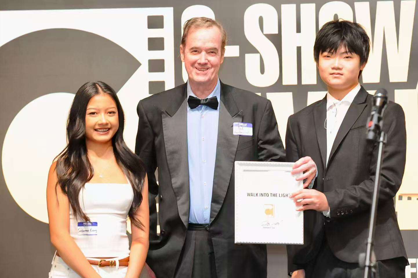 •中美电影节|中美电视节委员、美西编剧协会国际事务委员会负责人鲍勃·安德伍德为《WALK INTO THE LIGHT》主演Susanna Liang与Anthony Wang颁发“最佳微视频奖”