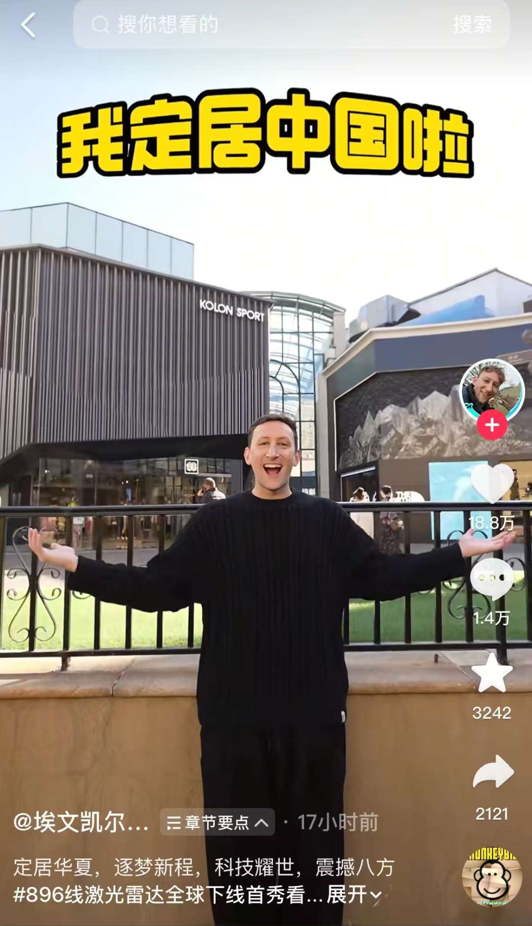 埃文·凯尔在社交媒体发布视频,宣布定居中国。(图片来源:埃文·凯尔个人社交媒体账号截图)