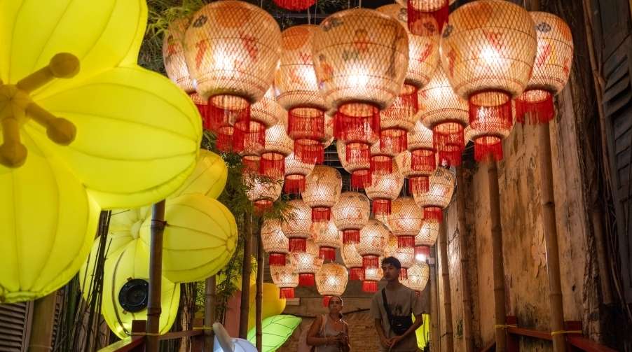 2025年10月1日,中秋节前夕,设在吉隆坡知名街巷鬼仔巷的“花月”灯笼艺术装置迎来众多民众参观。(图片来源:中新社资料图)