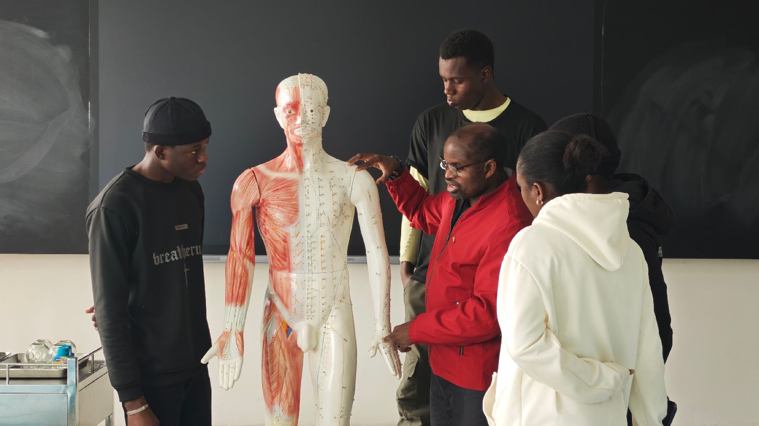 3月17日,迪亚拉(红衣)在向马里鲁班工坊留学生讲解经络走向。(图片来源:中新社)