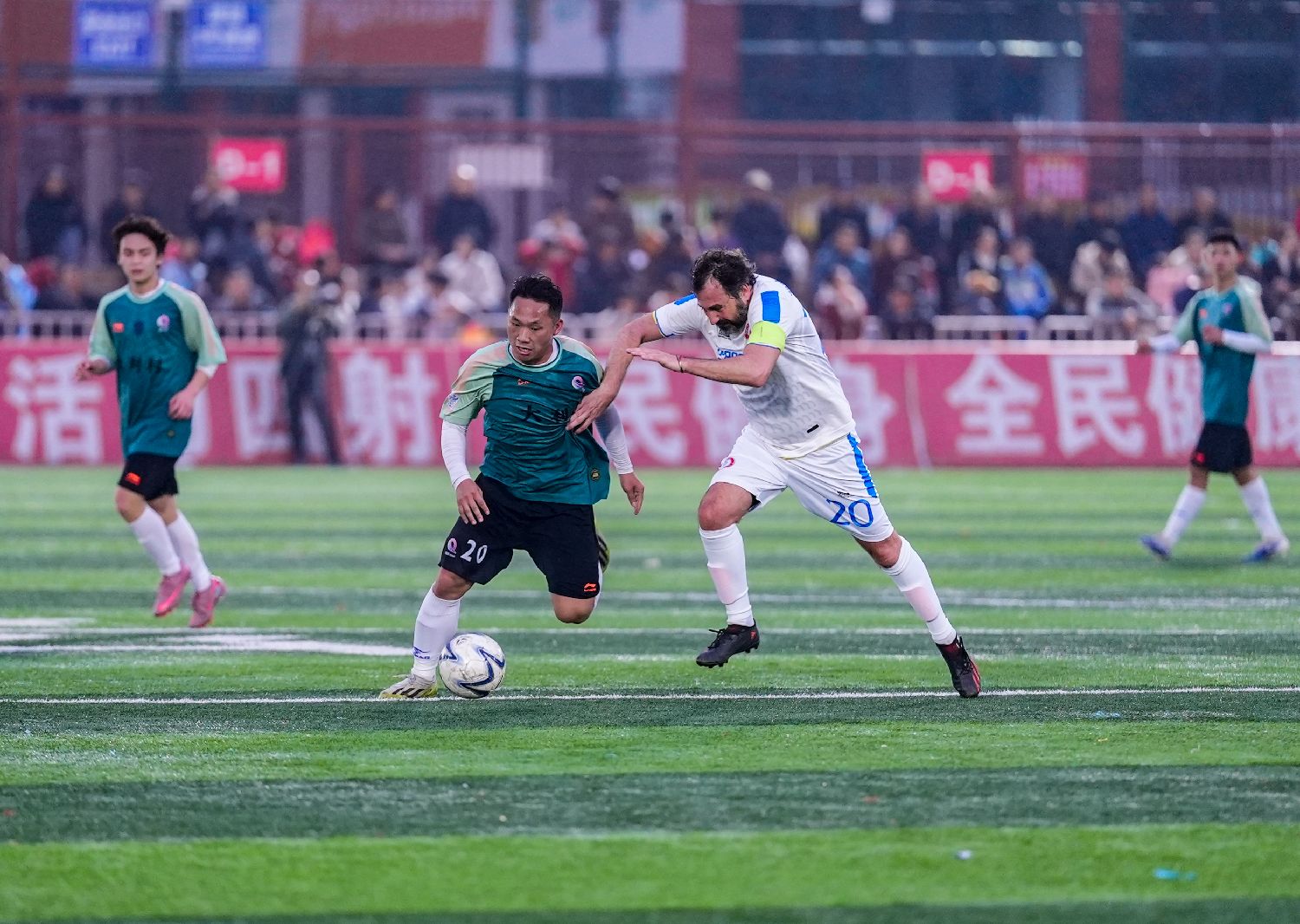 比赛中,双方拼抢激烈、配合默契,榕江县大利侗寨足球队多次发起精彩进攻,意大利球队则以娴熟脚法灵活反击。最终,意大利罗马工程师协会足球队在加时赛最后50秒攻入关键一球,以4:3取胜。