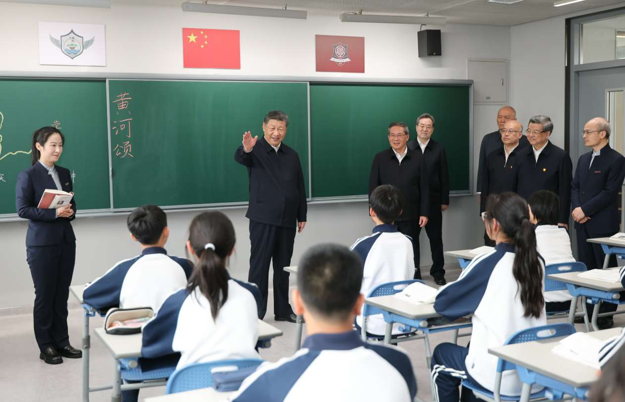 23日,习近平在北京四中雄安校区考察时,走进教室同师生亲切交谈。(图片来源:中新社)