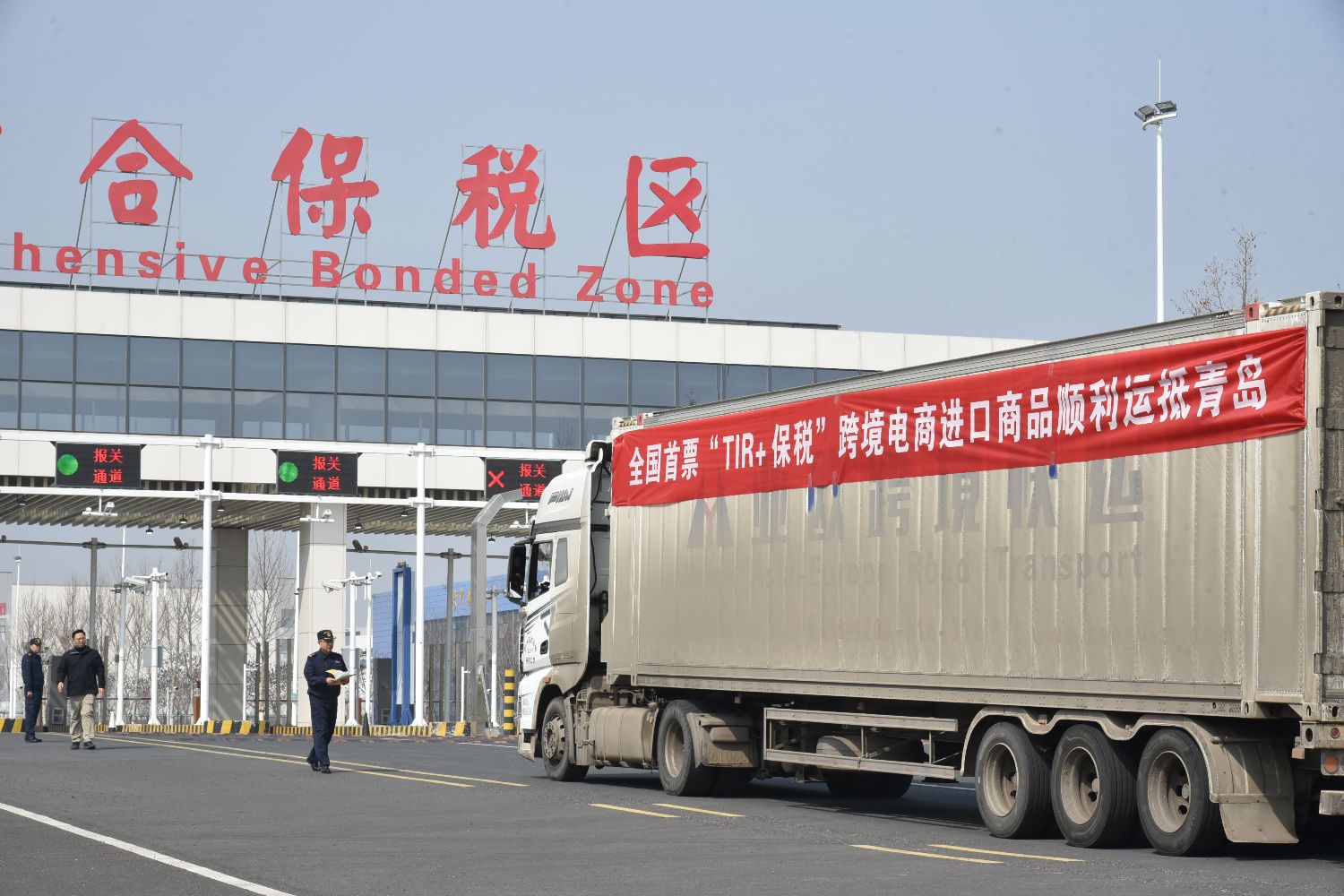 3月26日,一辆TIR国际运输车辆在青岛空港综合保税区顺利通关。(图片来源:中新社)