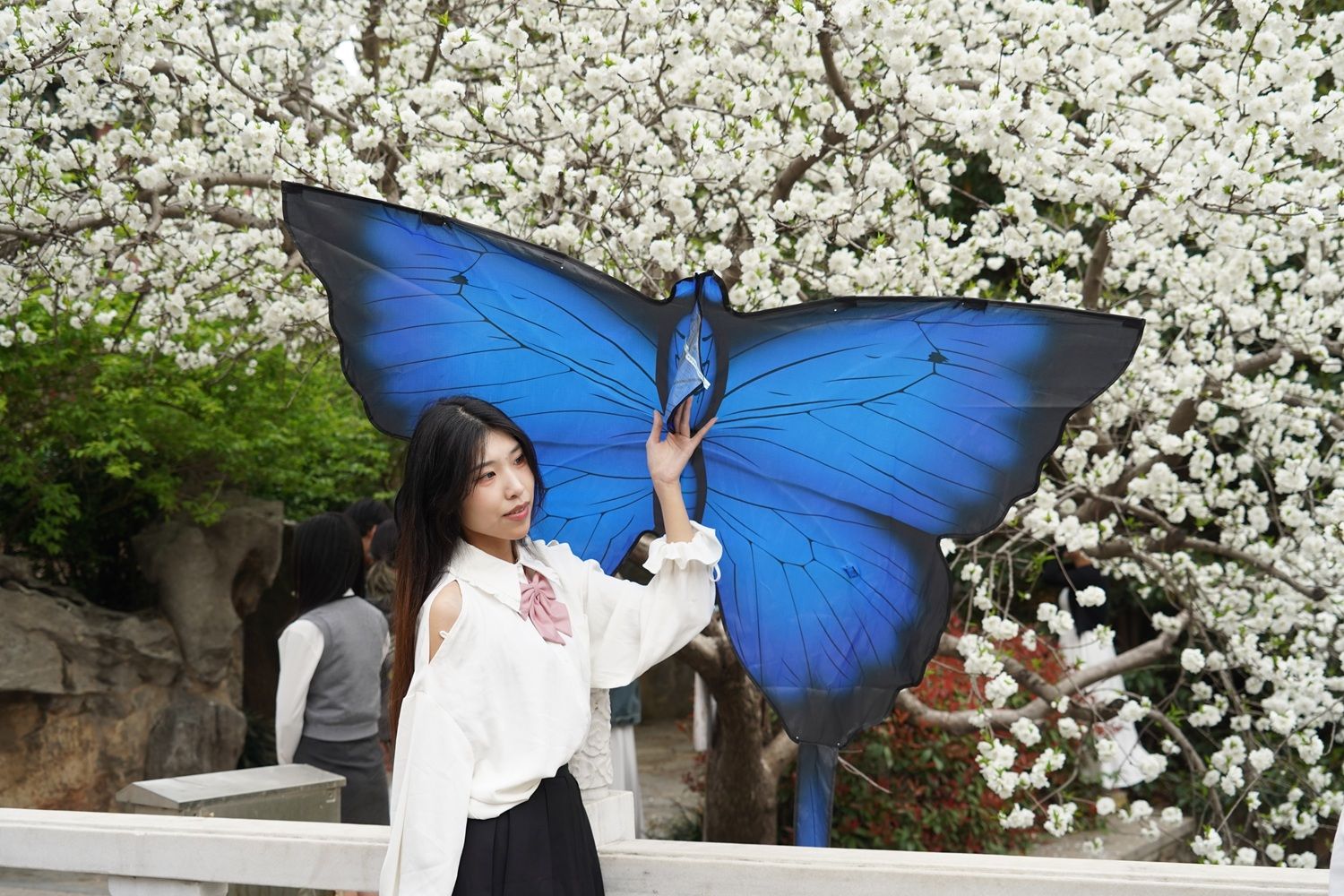 3月25日,河南郑州气温回暖。不少市民踏青赏花,乐享春日时光。图为市民在樱花树下手举风筝拍照。(图片来源:中新社)